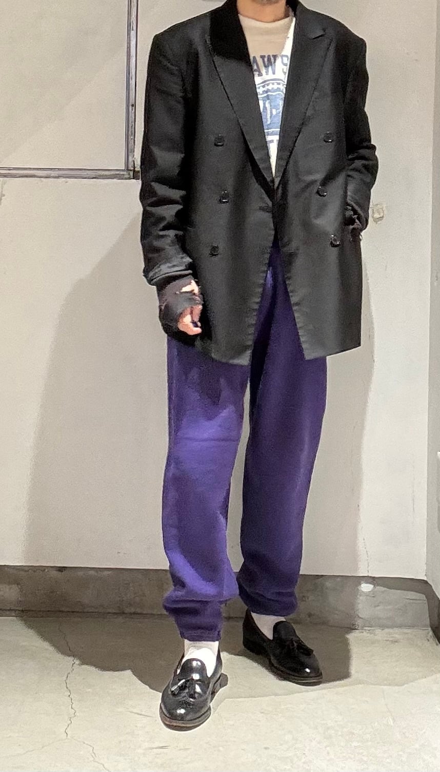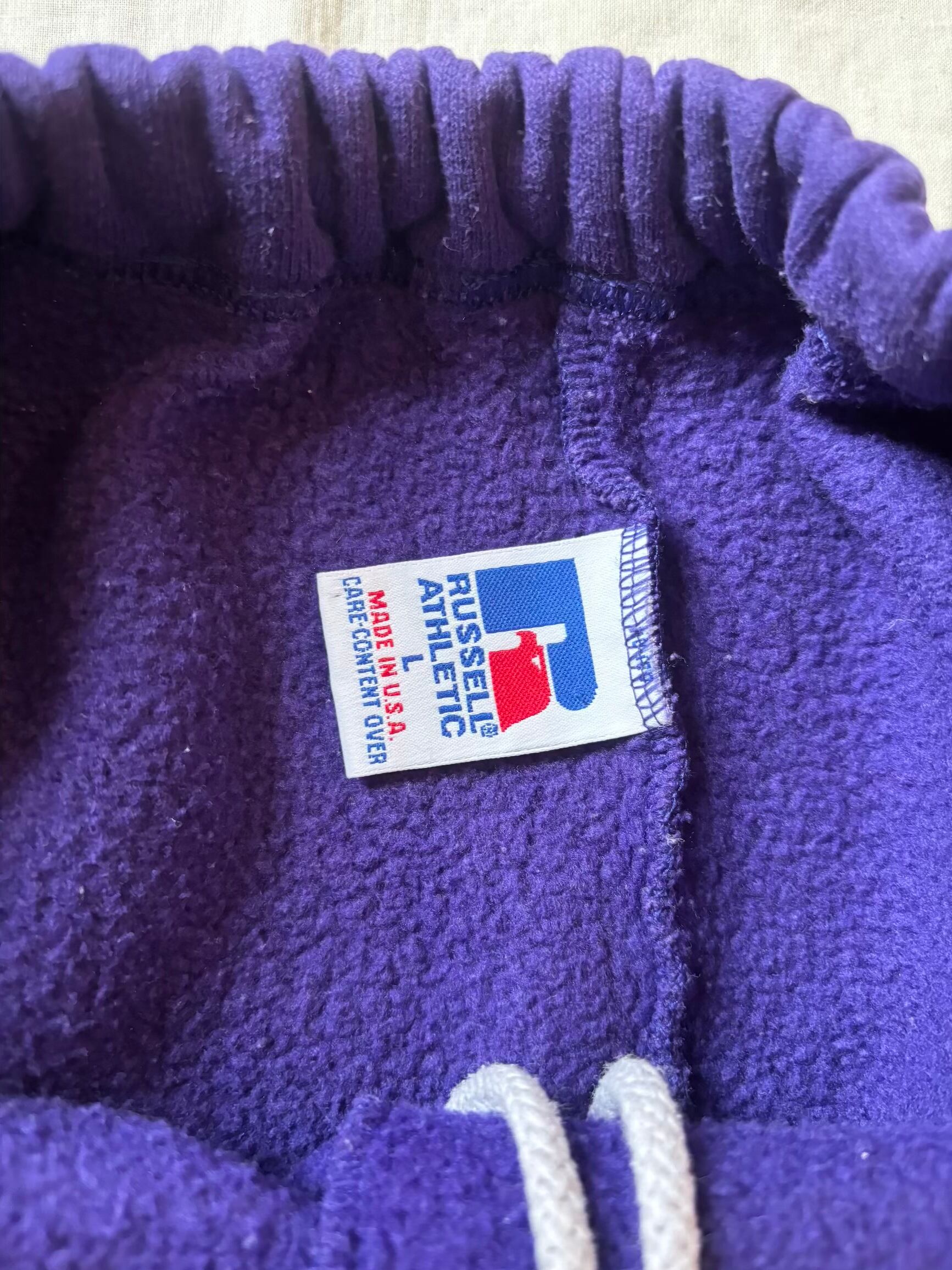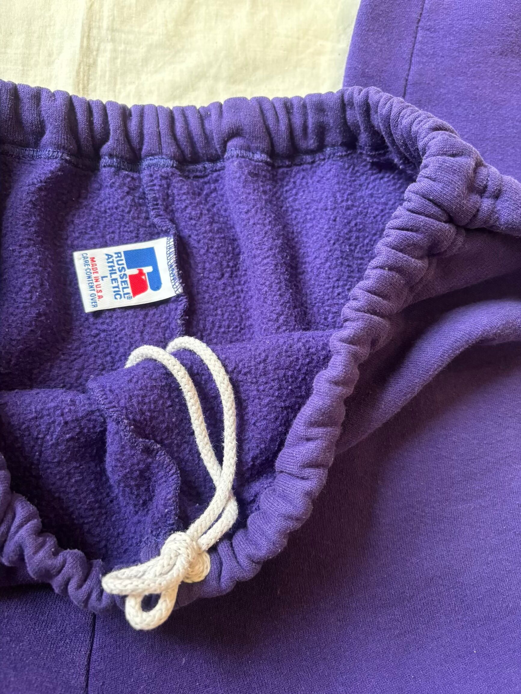 レアカラーです。パープルのラッセルアスレチックのスウェットパンツはなかなか出てこないと思います。このくらいの年代になるとファッション要素が入りこのようなオシャレなカラーのスウェットパンツも出していたようですが、さすがにパープルはほとんど見かけた事がないですね。チャンピオンなどでたまに見かけるくらいだと思います。