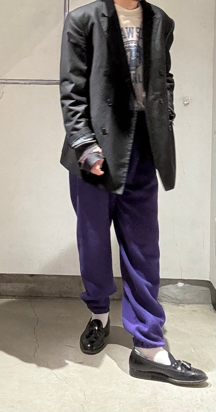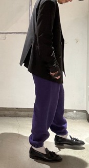 全体的にゆったり目なサイズ感なので履ける方も多いと思います。裾ゴムで縛られているので、逆にそのシルエットを利用して少しボリュームのあるシューズを合わせるのもおすすめです。ローファーもご覧とのおりとてと合います。