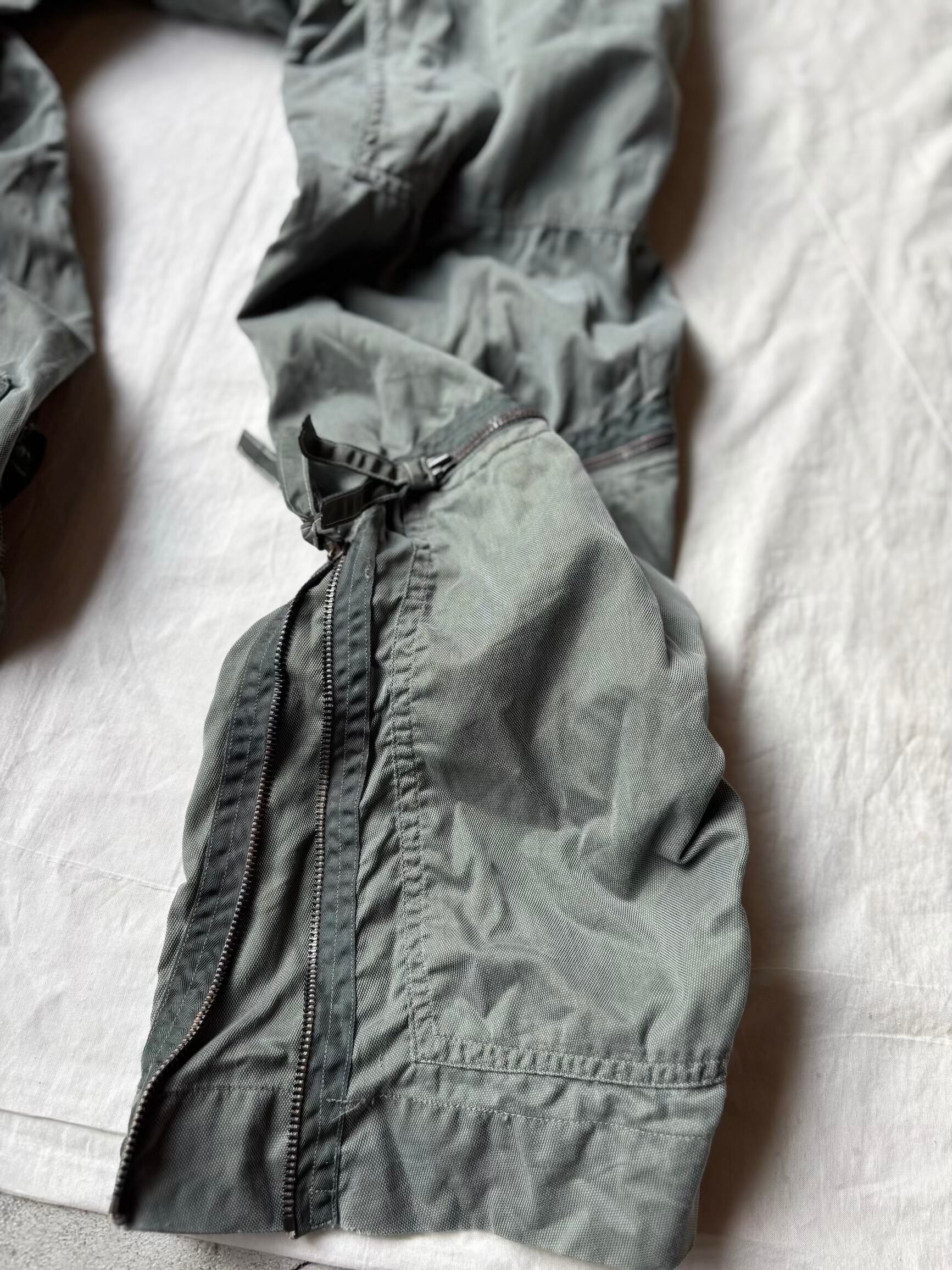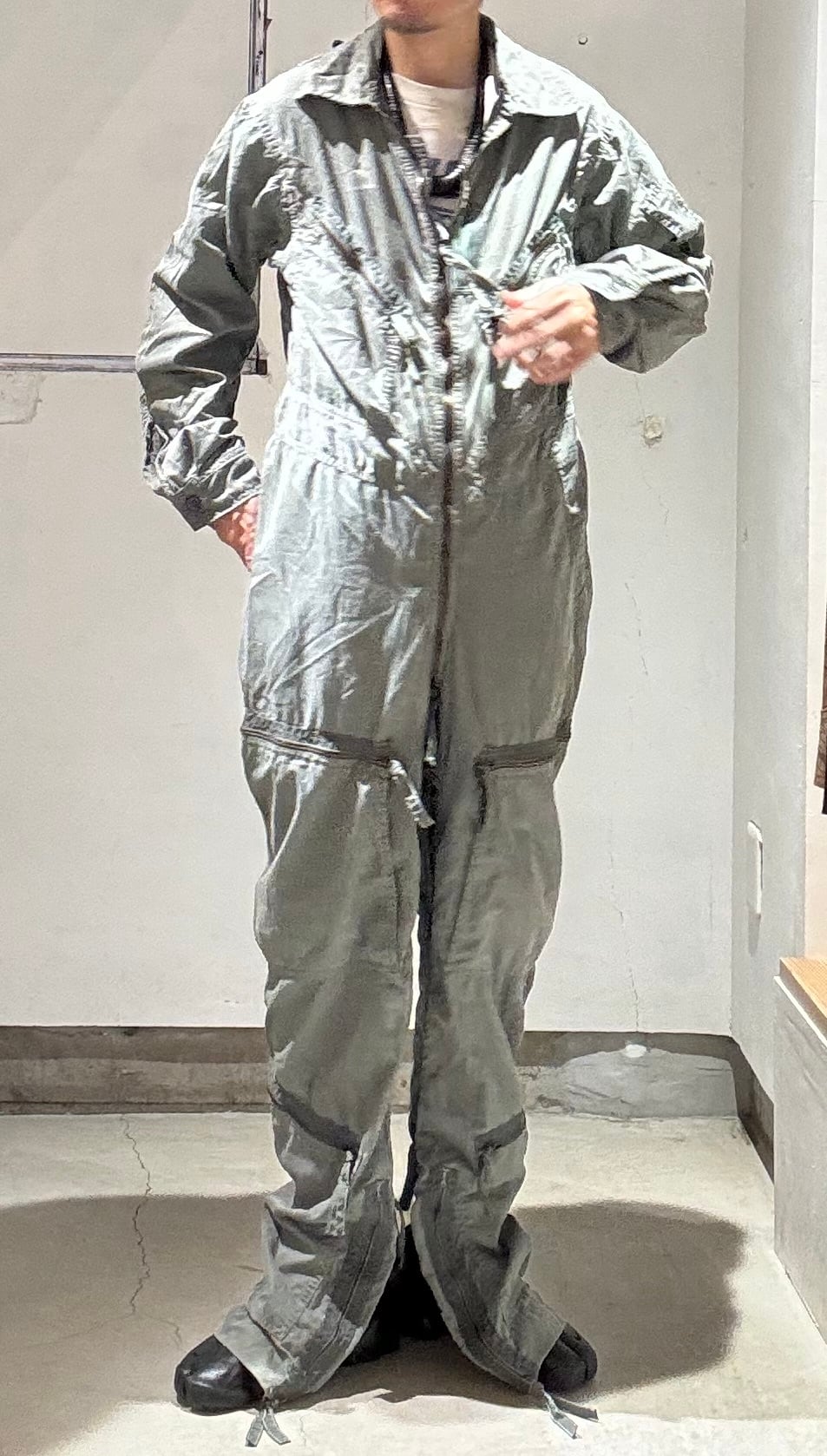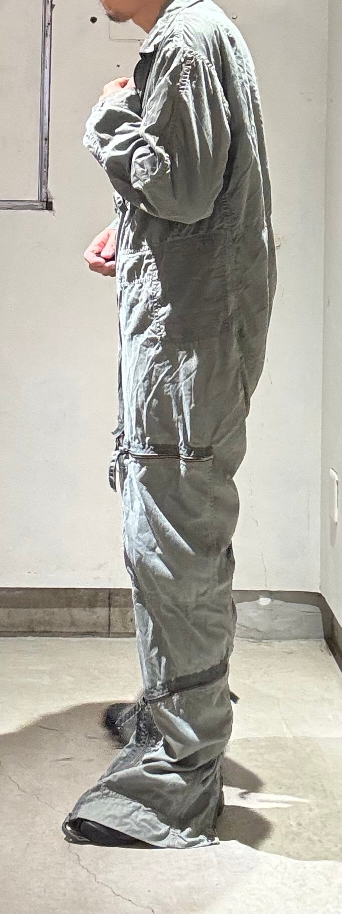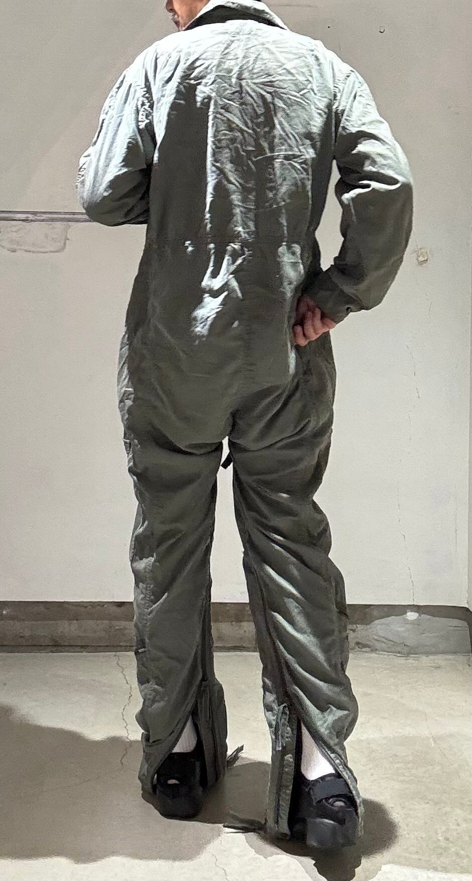 基本的に戦闘機のコクピットはかなり狭い状況なので、フライトの邪魔にならない様にフライトスーツはタイトに作られています。更に古い年代になればなるほど、軍人さんも身体が小さいのであまり大きなサイズが出てこない事が多いですが、こちらはまだ大きい方で、身長が180㎝前後の方に丁度良いと思います。ただ細めな作りなので、ガッチリした方には小さくなってしまうと思います。