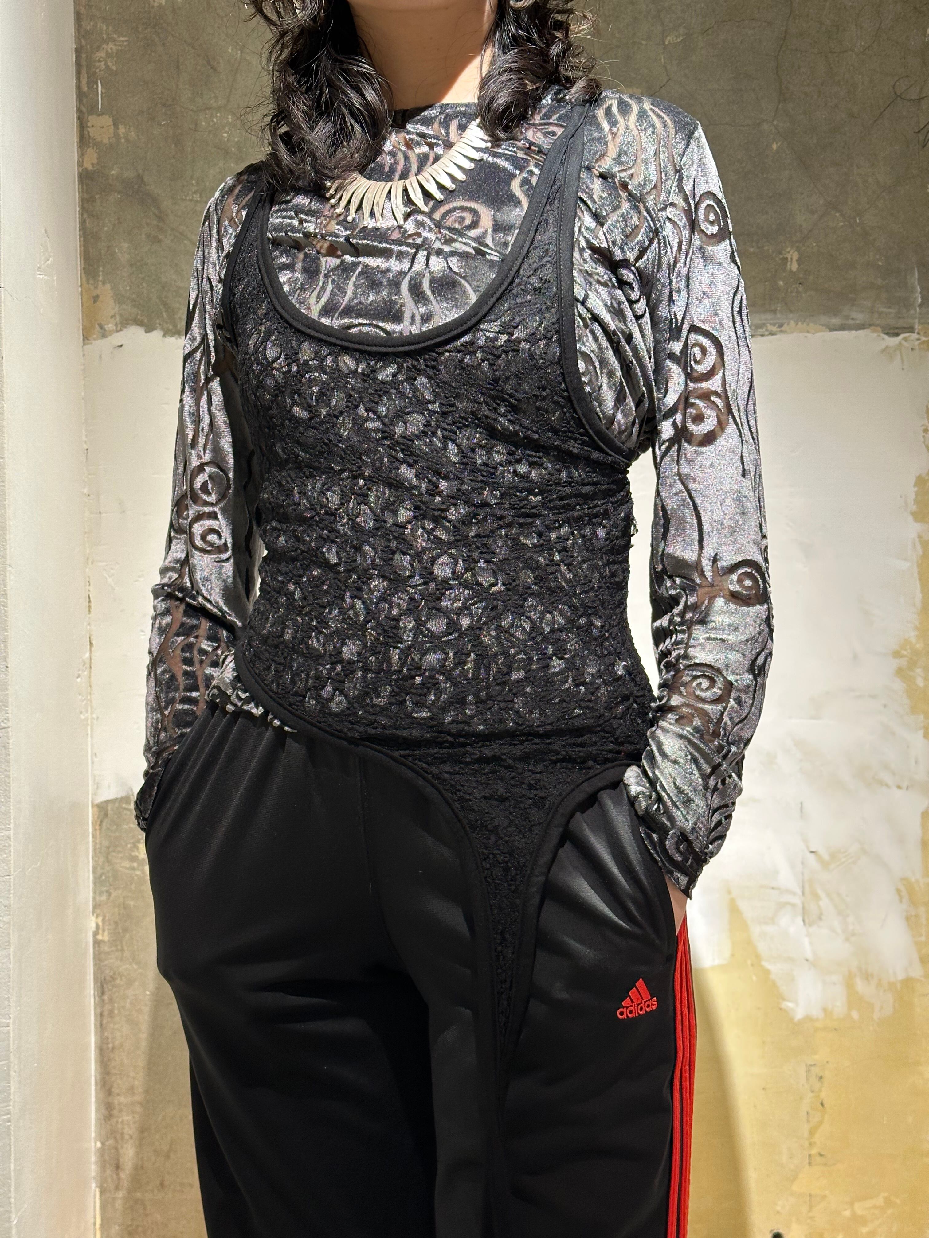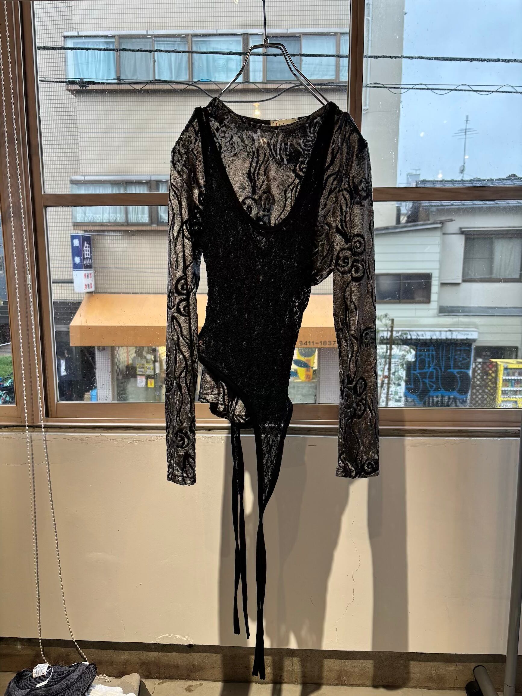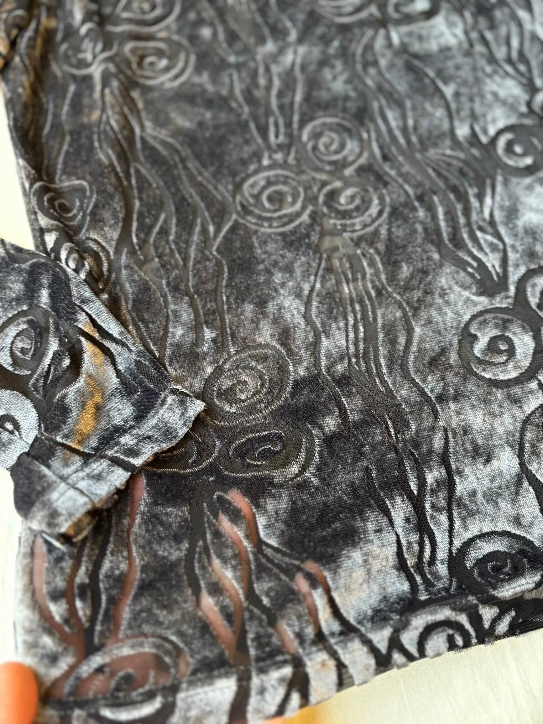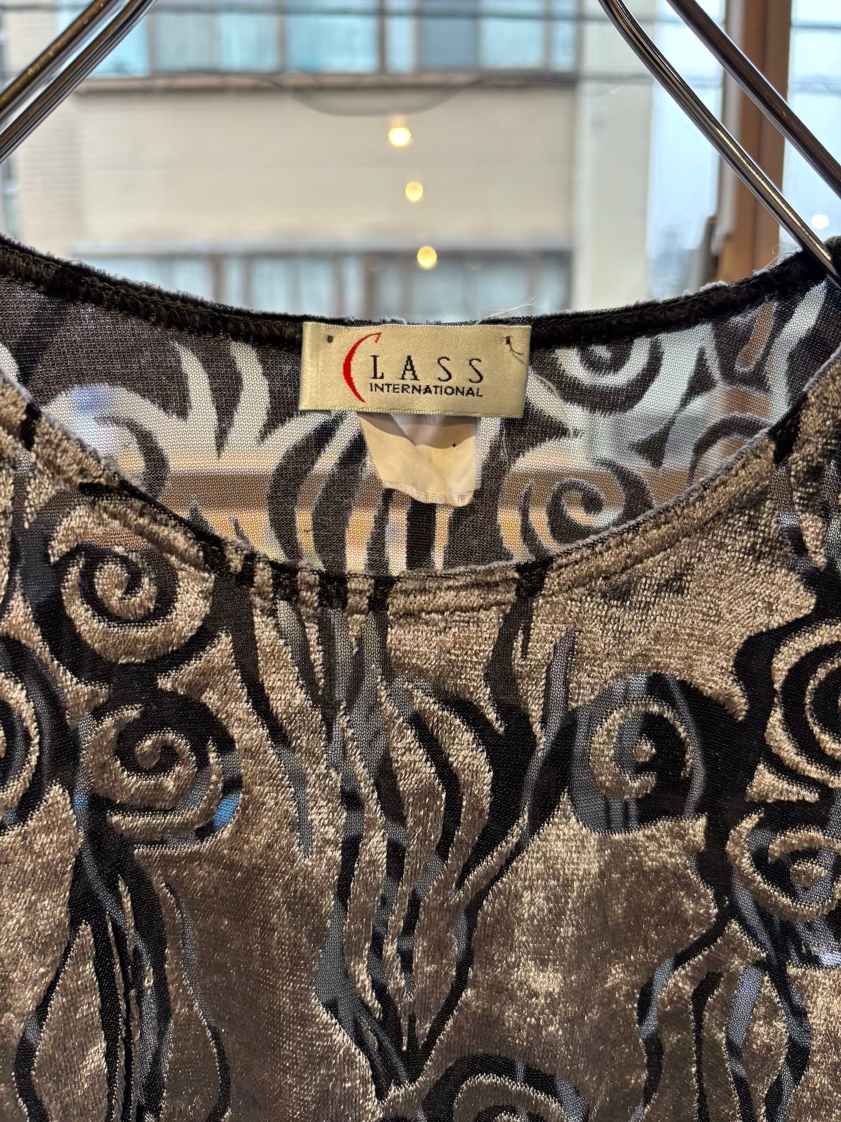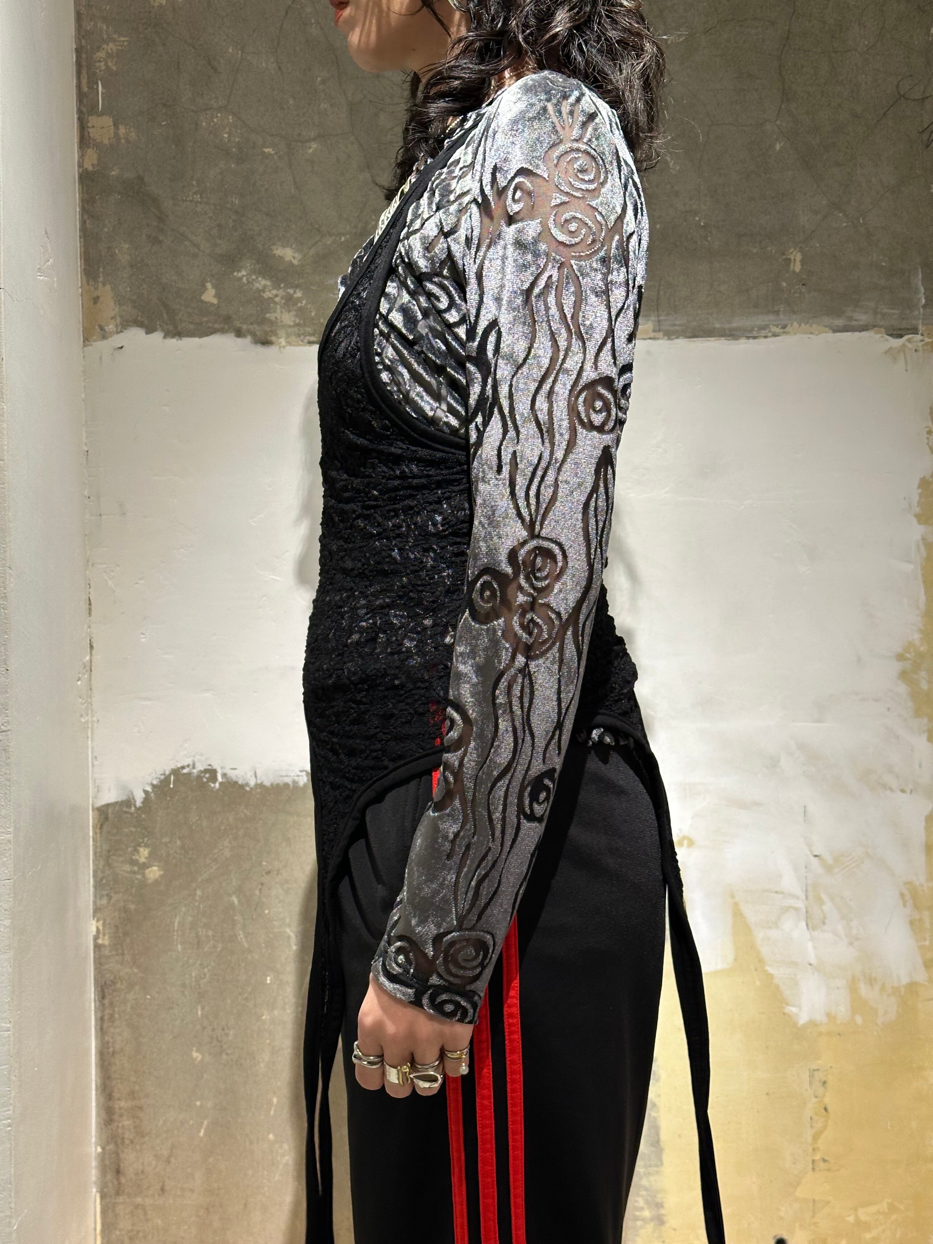 シルバーグレーのボディにウネウネの柄が入り柄のところが透けているカットソー。長袖のインナー迷子の方も多いと思うのでおすすめです。首の開き方が程よく開いていて顔周りがスッキリ見えやすいと思います。