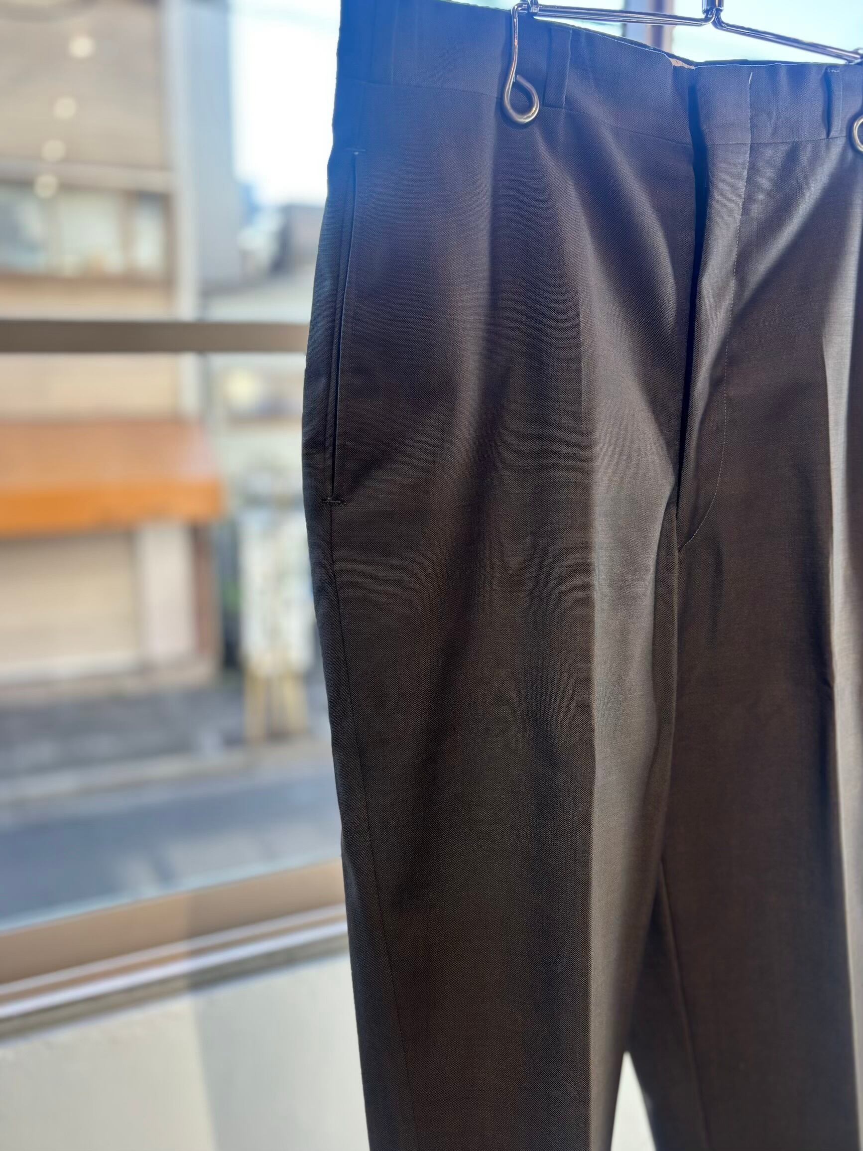 スウェットや春のニット、シャツなどと軽く合わせたくなる季節になってきました。普通のウール生地では表現されない独特の光沢感がとてもかっこいいトラウザーズだと思います。