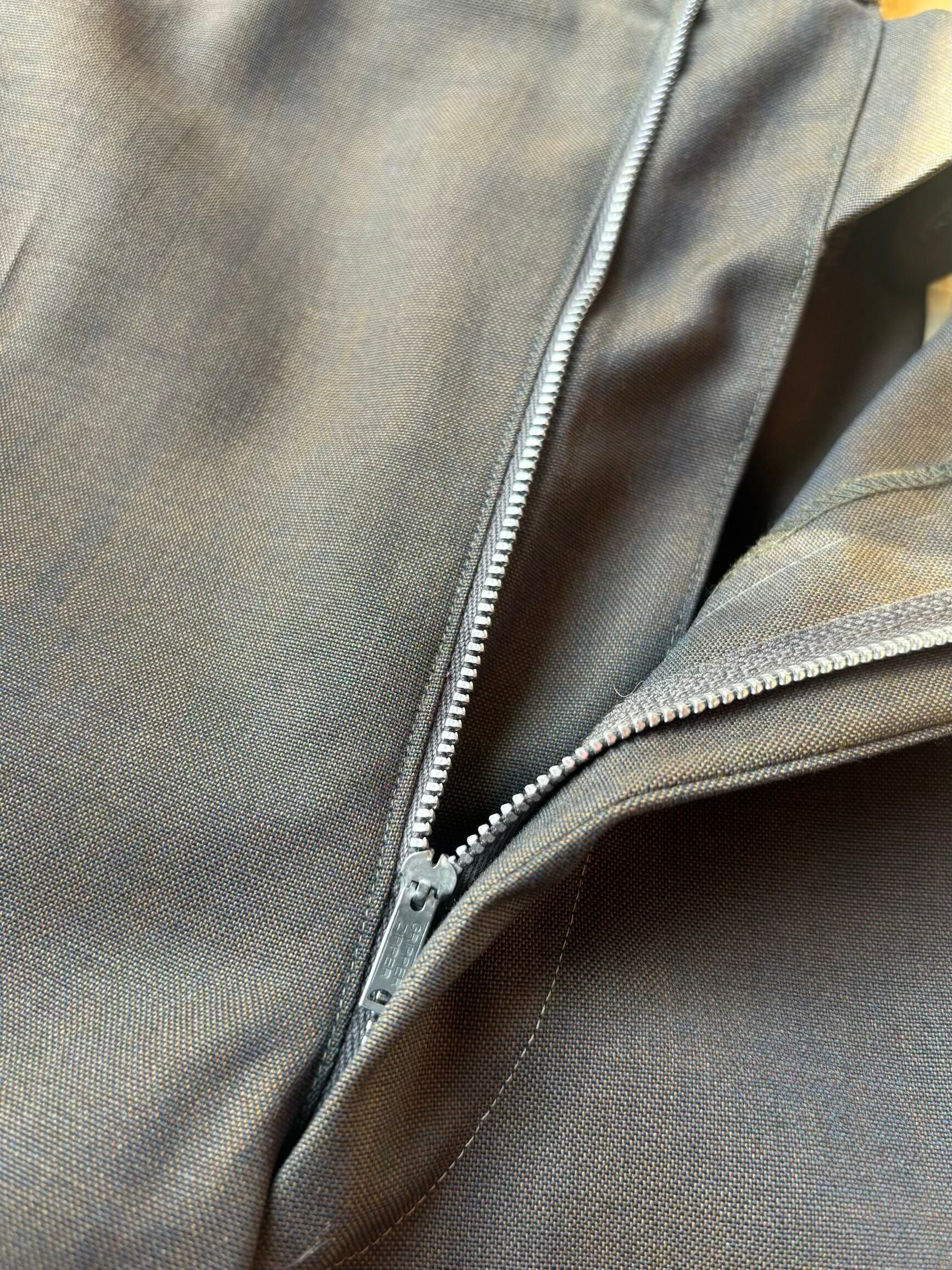 古いグリッパージッパーが付くビンテージトラウザーズ。股上が深めで緩めにテーパードが掛かったシルエット。生地は縦糸横糸の色が違う事で玉虫色の光沢感のあるハリのあるウール素材です。とても珍しい生地のトラウザーズです。