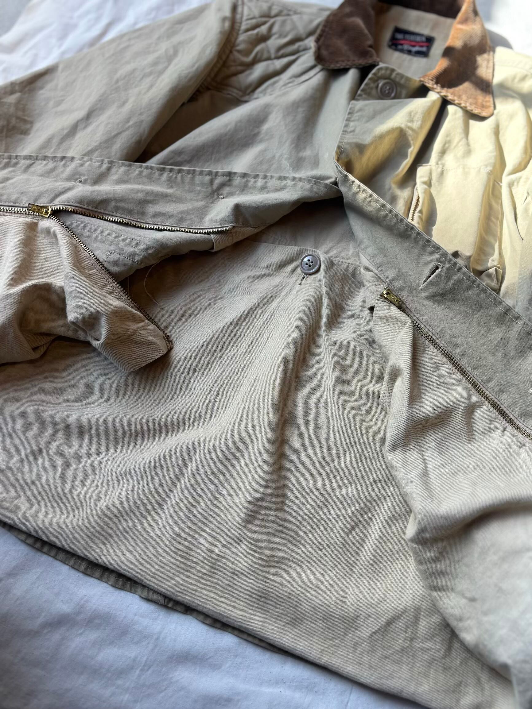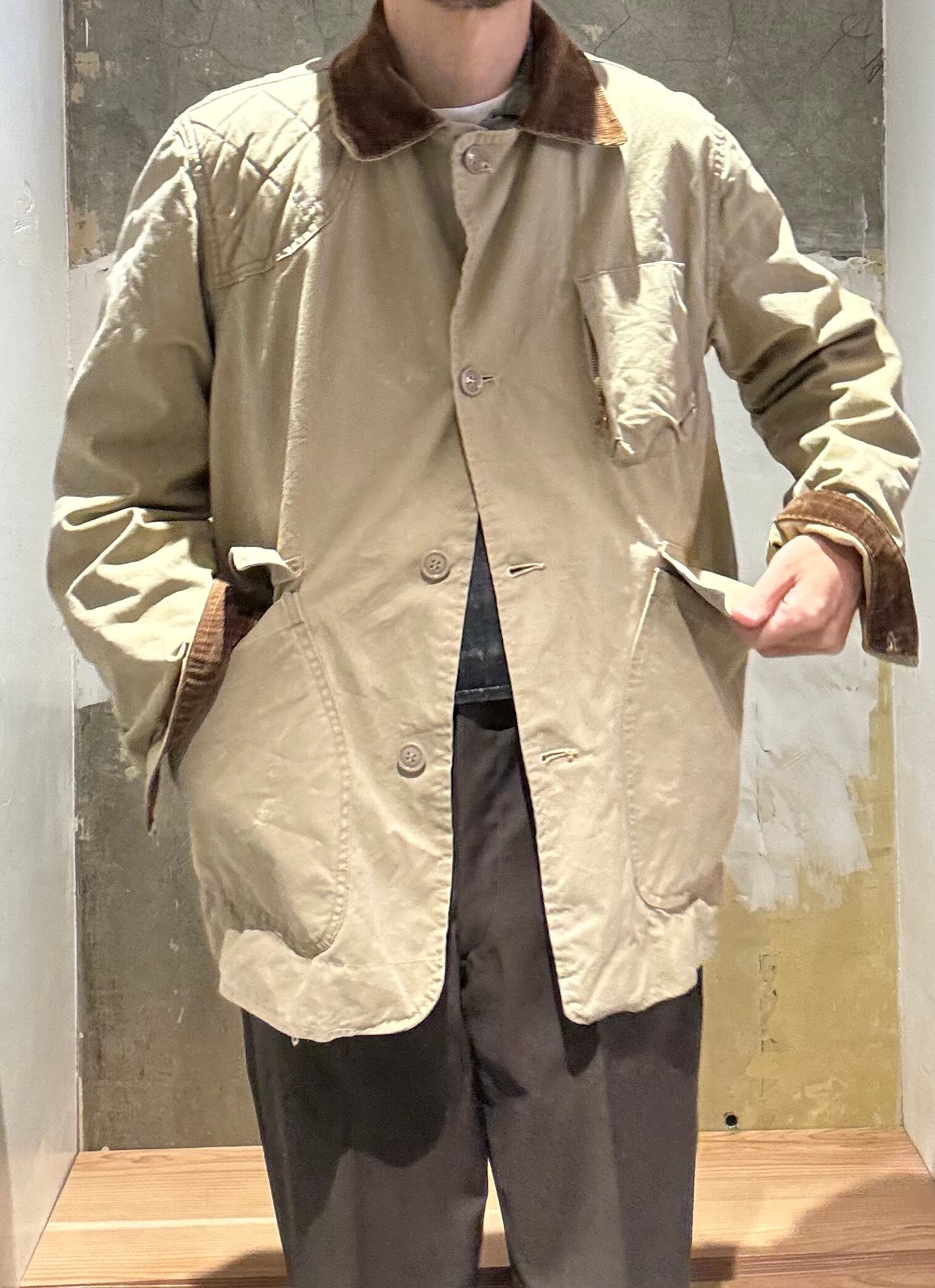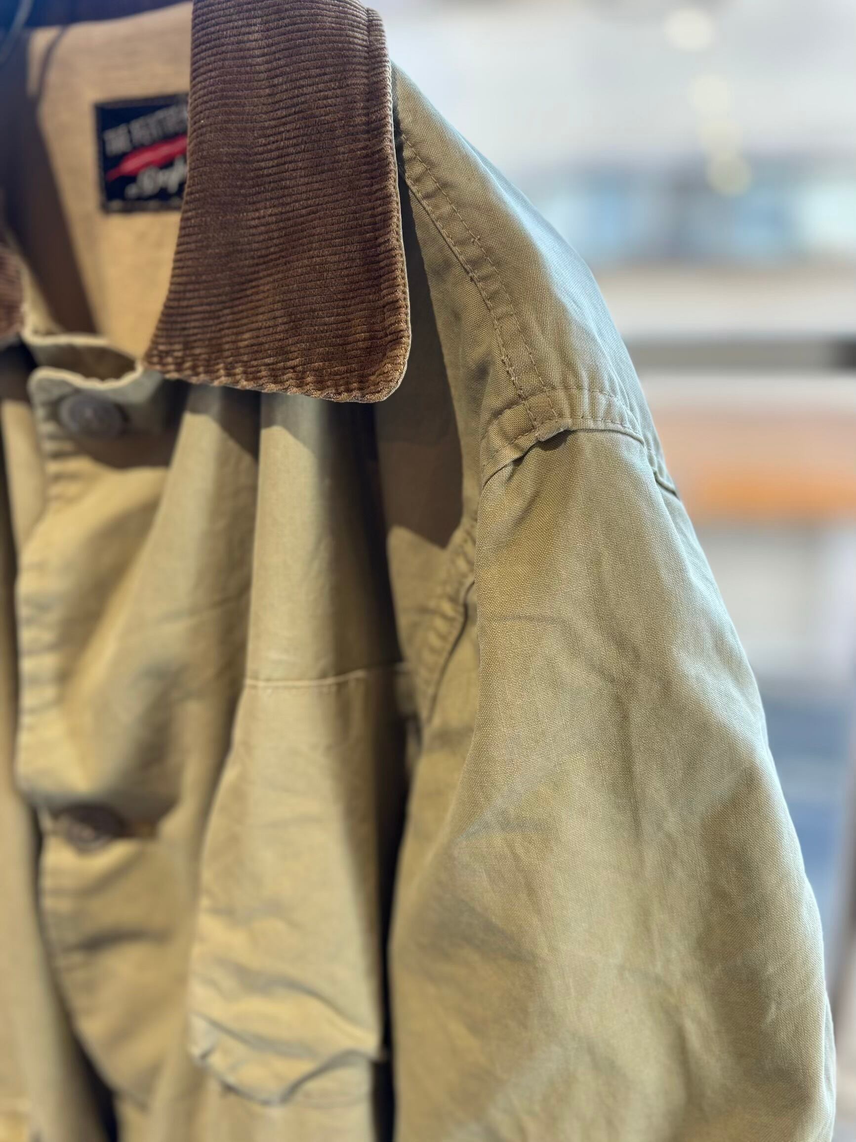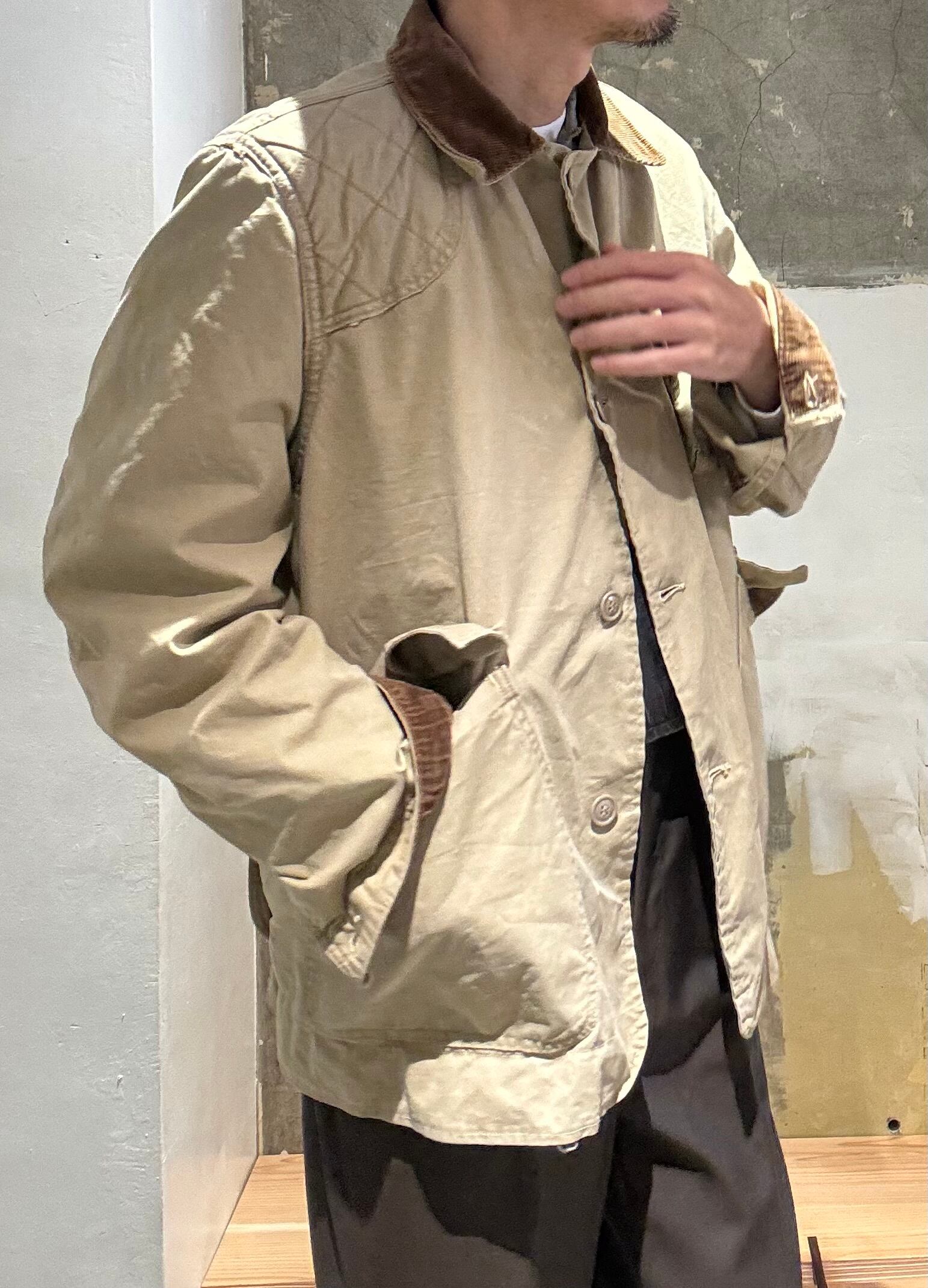 大変珍しいコットンポプリンの薄手の生地で作られた春夏用の生地の古いハンティングジャケット。襟と袖のコーデュロイの切り返しもアクセントになって可愛いです。