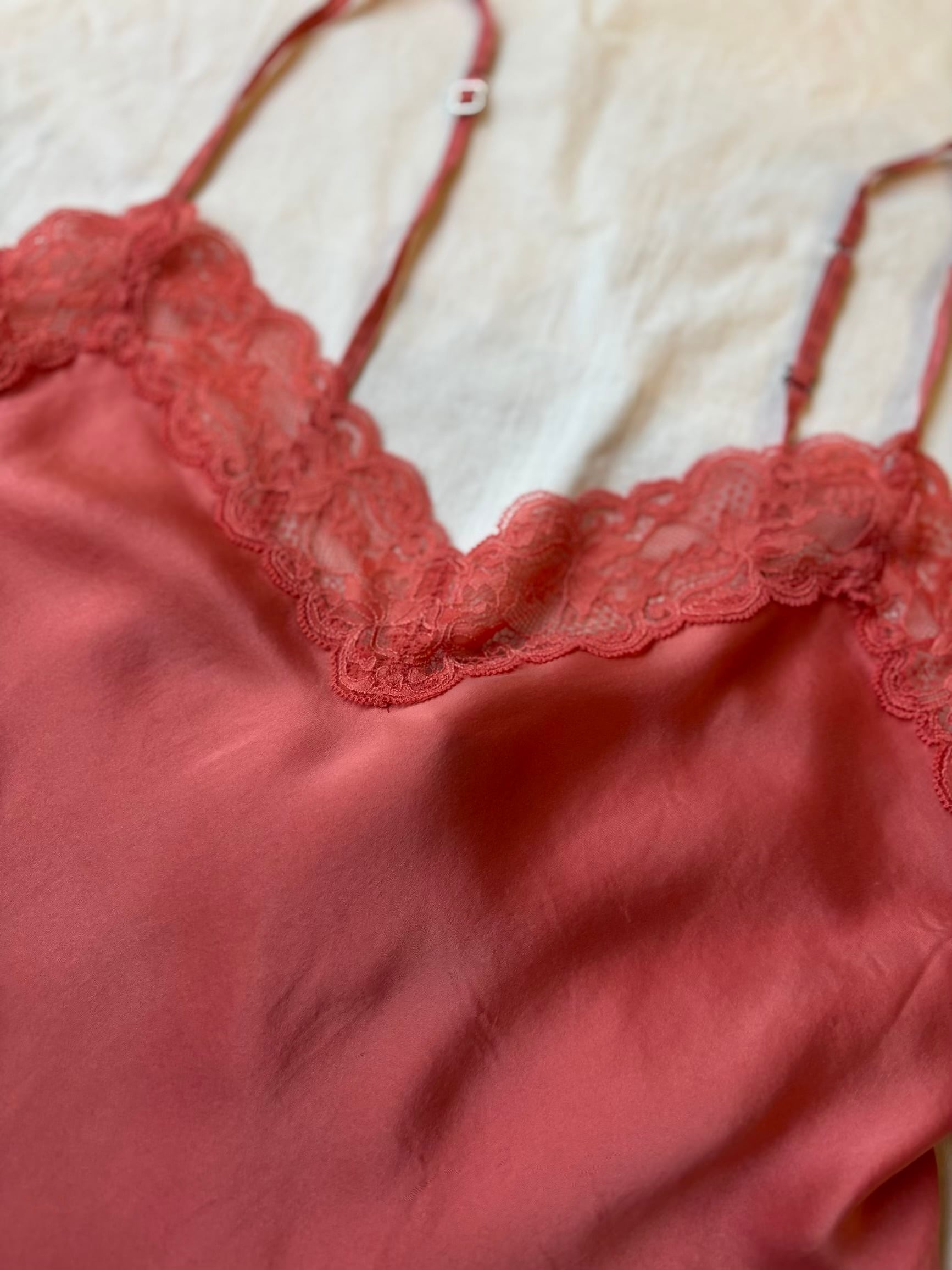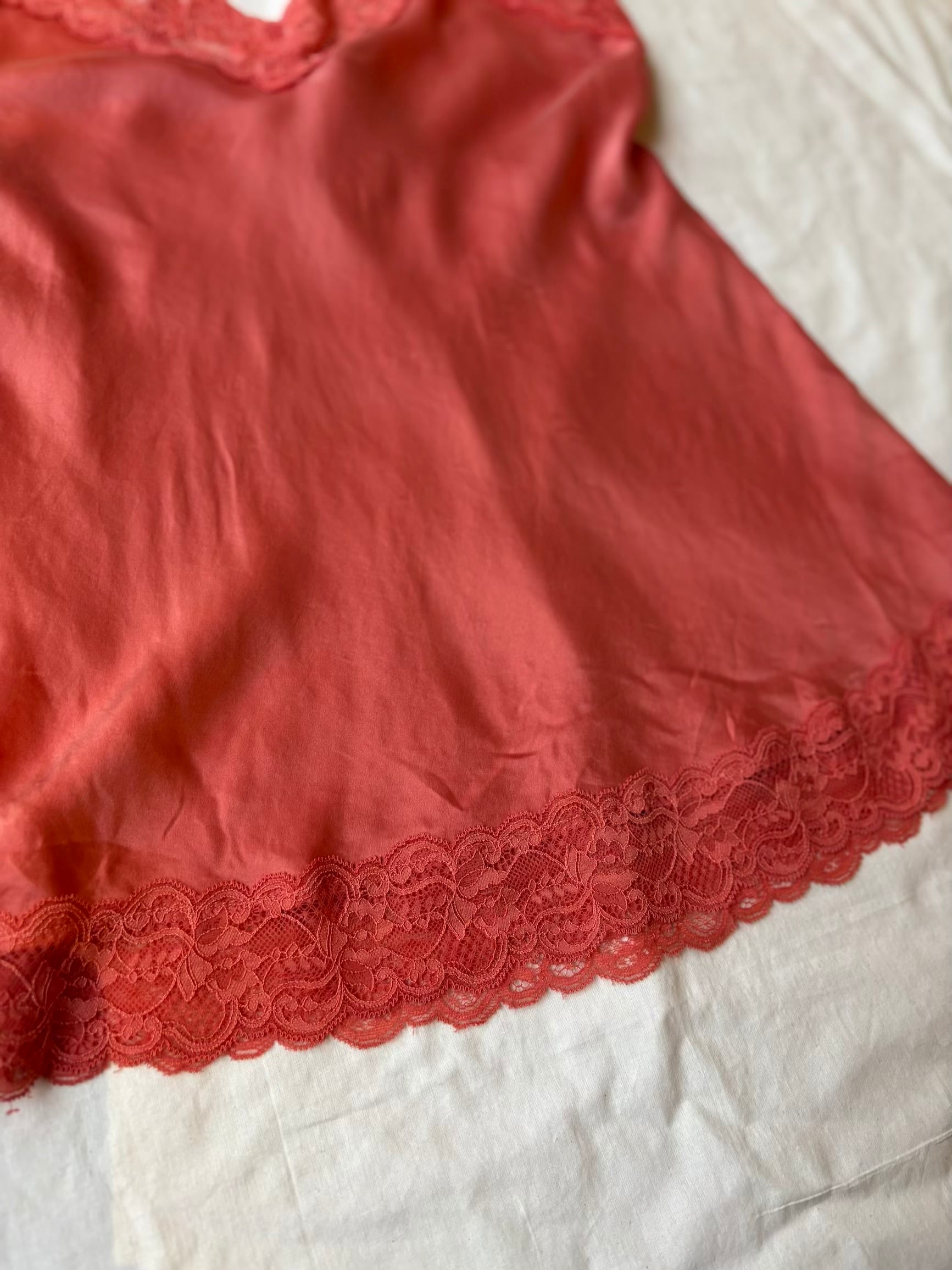 ピンクが混ざったようなオレンジ色の絶妙な色のシルク素材。キャミソールでシルクを使っているのでかなり贅沢なアイテムです。レースもとてもシンプルで王道のレースで、甘すぎる分量でもなく丁度いいかと思います。