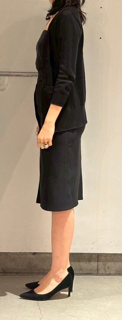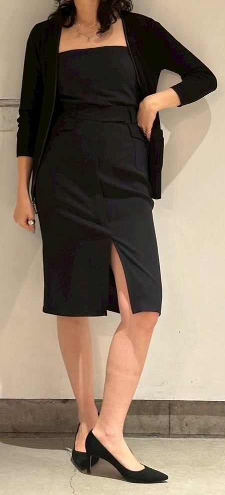 スカートでは今主流の丈のミディ丈ですが、苦手な方はインナーにトレンドのタイツを履いても良いと思います。この丈は下半身がスッキリ見えやすいのでトップスはタイトにしてもオーバーにしてもどちらでもバランスが良くなるので、案外便利な着丈です。