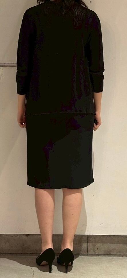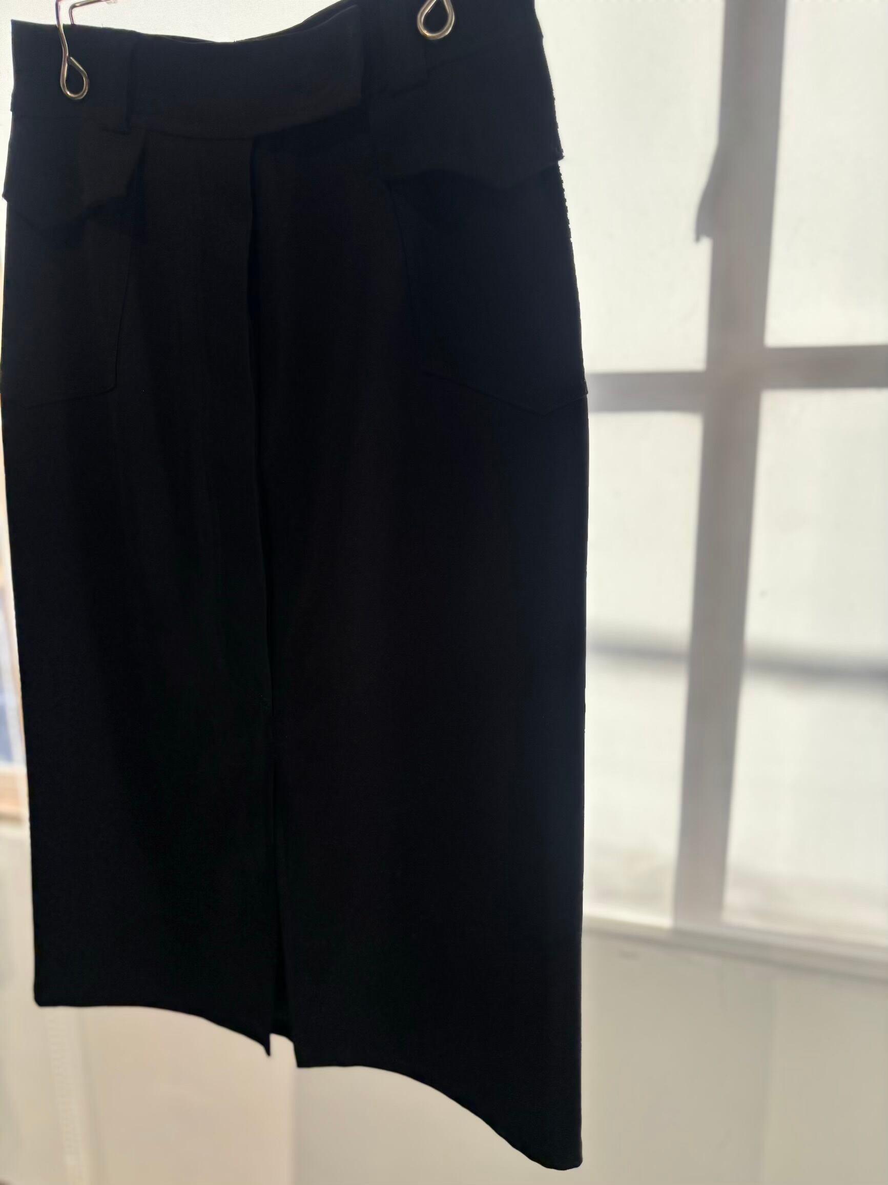 とても上品なシルエットのスカート。素材がポリエステルスパンデックスでストレッチ性がかなりあるので着てもストレスにはならないと思います。腰に大きなカーゴポケットのようなものが2つ付き、裾に向かって絞りのあるシルエットでとても綺麗です。