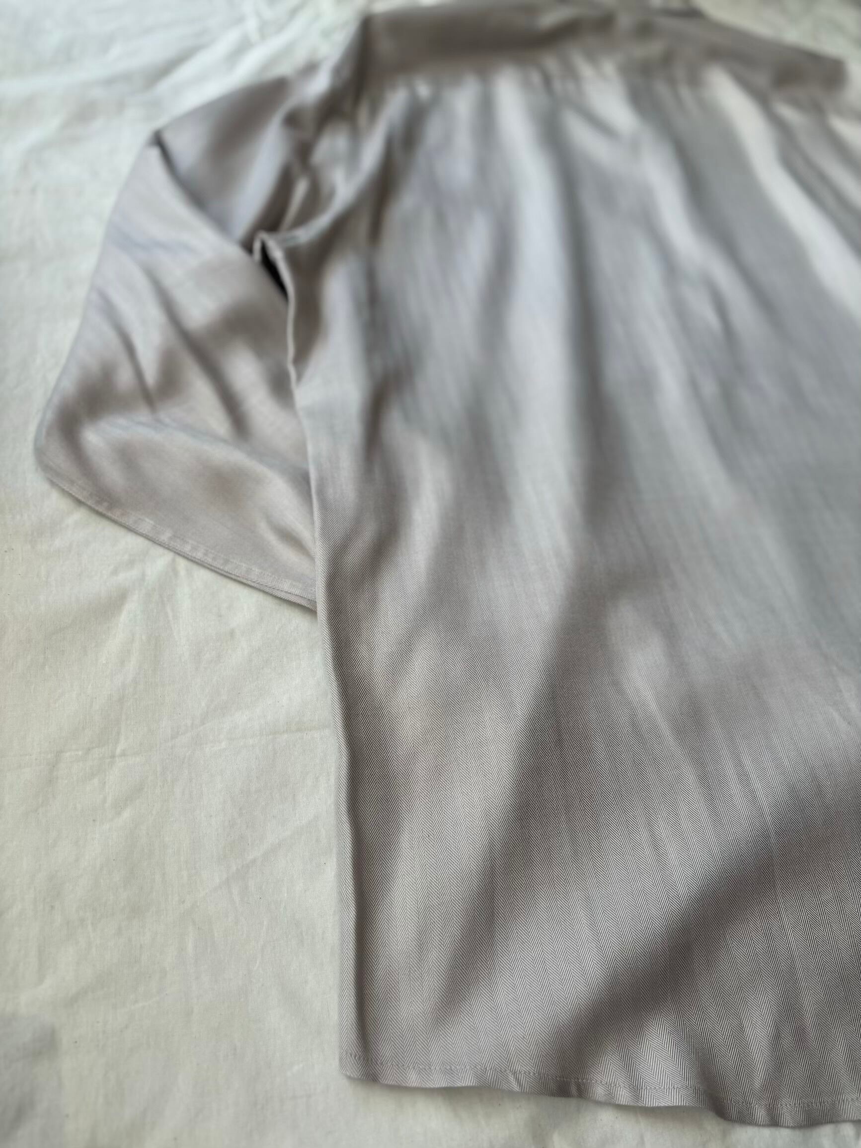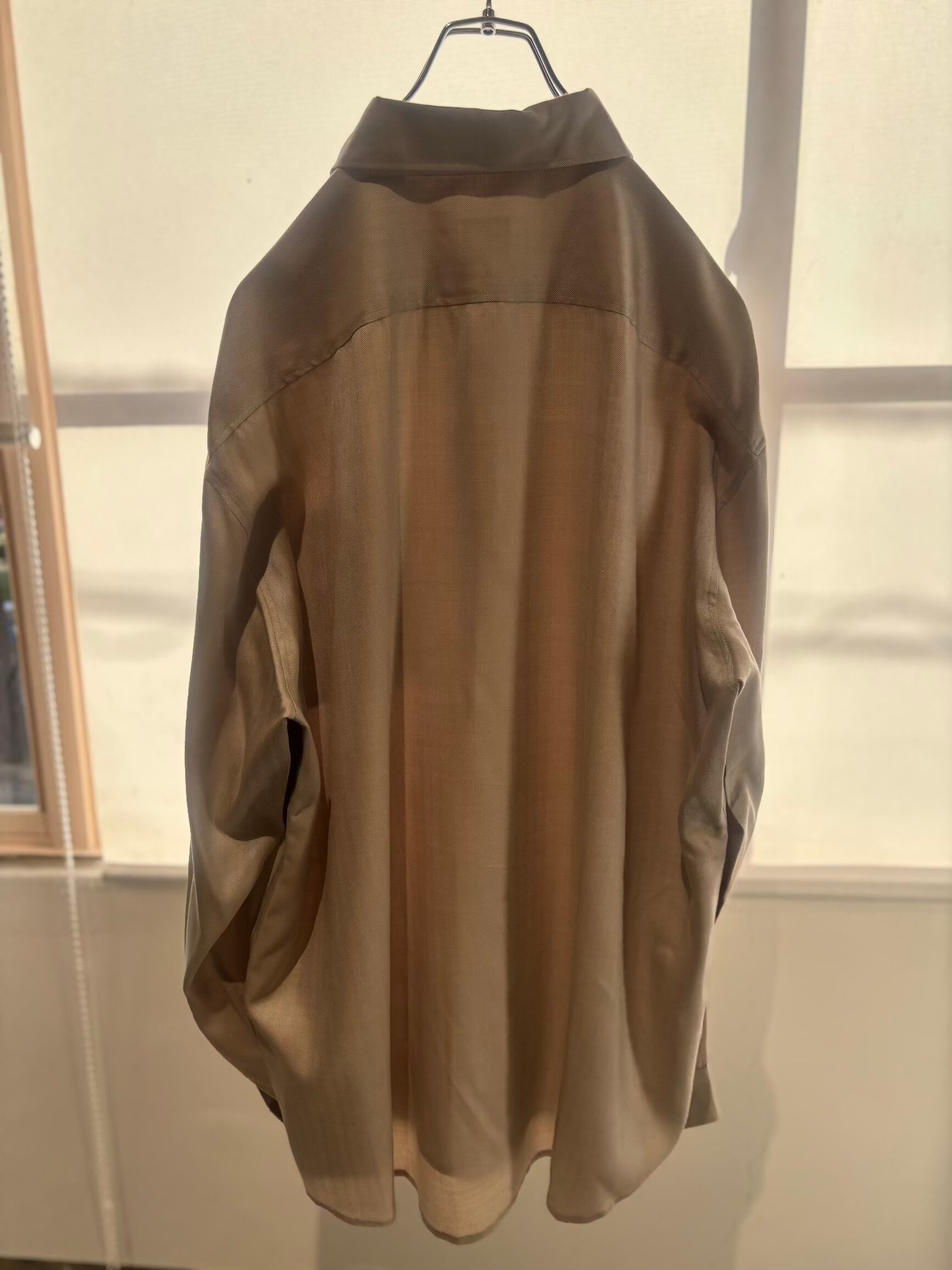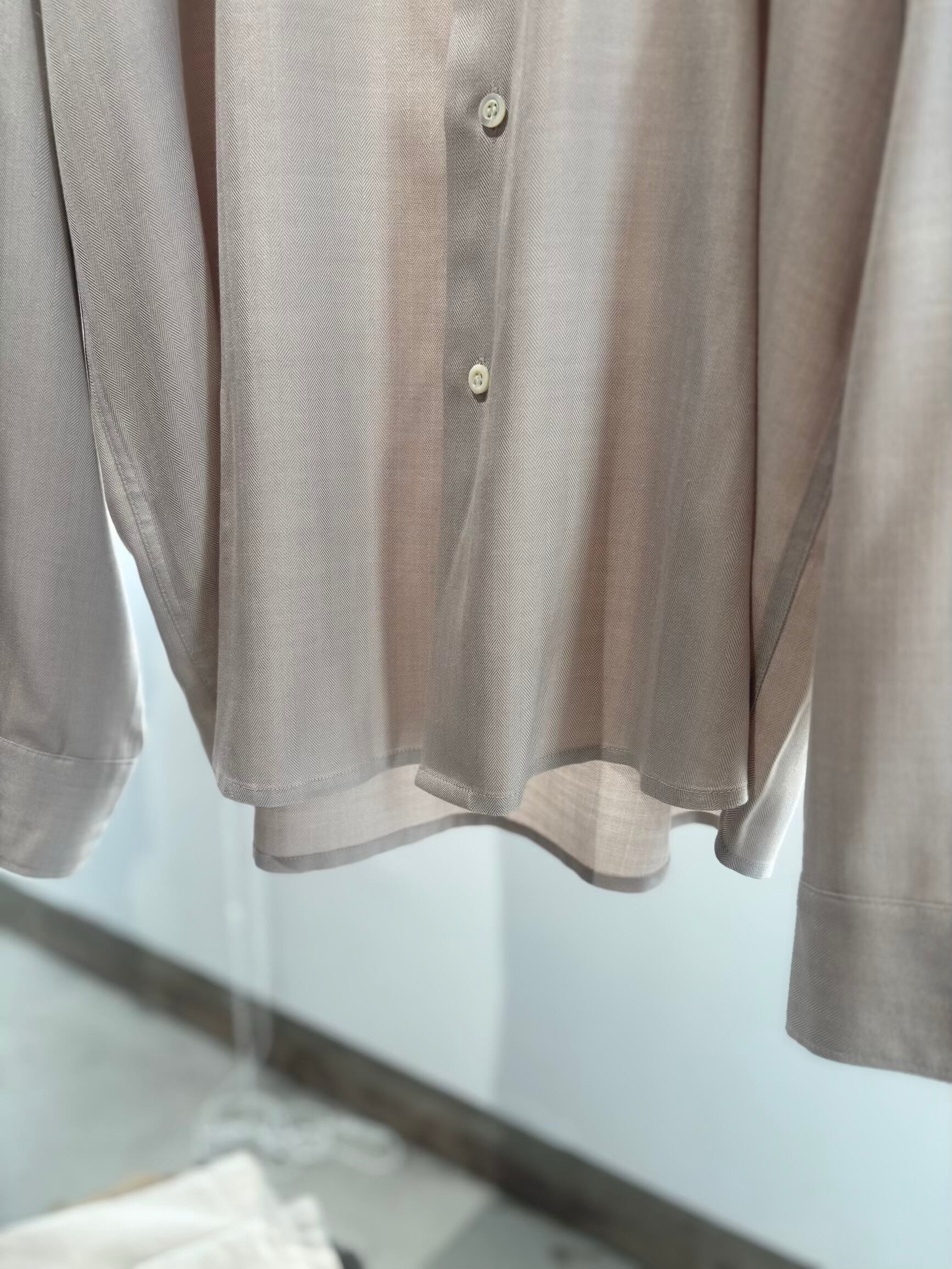 見ただけで高級感があるヘリンボーンシルク。着たりハンガーに掛けておくと素材感の陰影でドレープがとても出てめちゃくちゃ綺麗なシャツです。着ているだけでもすぐに分かる位高級感があるシャツです。