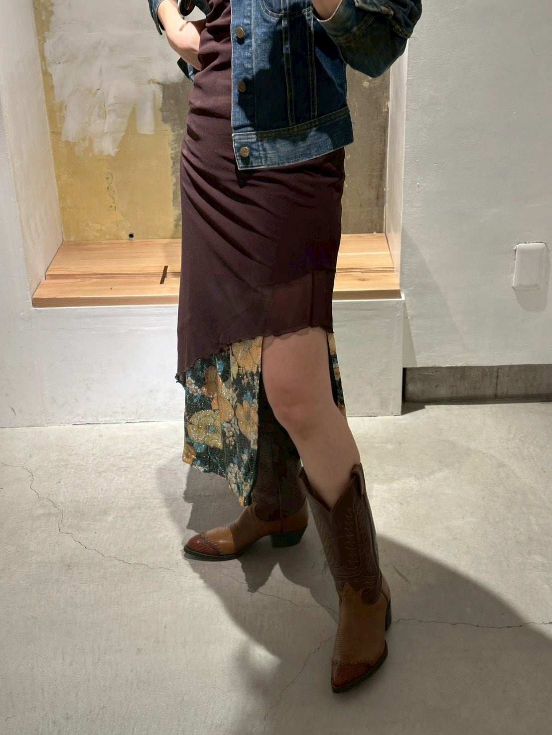 足元のスリットは両サイドに深く入っているので、ボトムスを重ね着した方が安心です。もし気になる方はお直しで少しだけスリットを閉じてしまっても構わないと思います。ボトムスの重ね着はタイトドレスなのでごわつくかも知れませんので、今トレンドのタイツを履くのも良いですね。