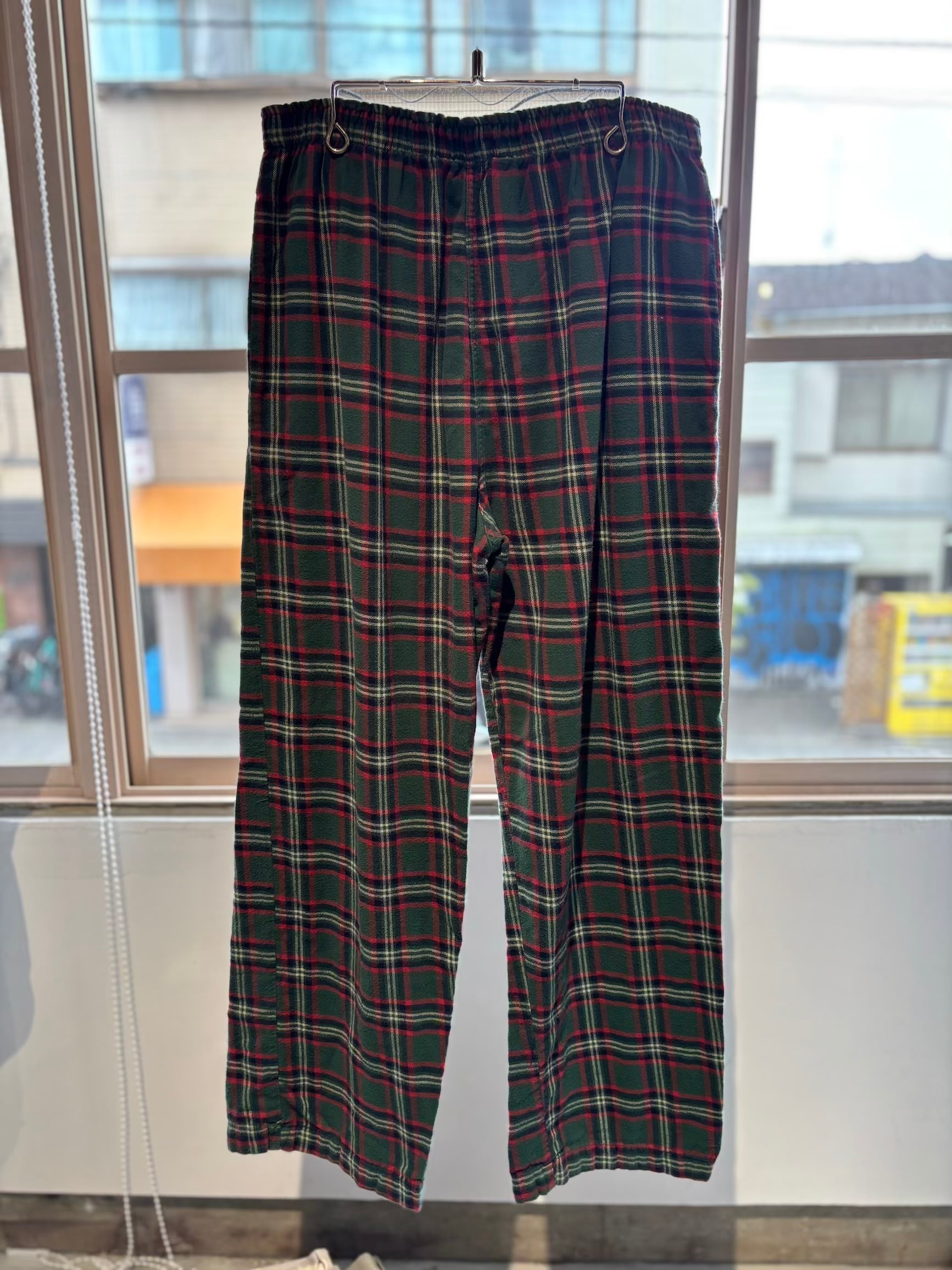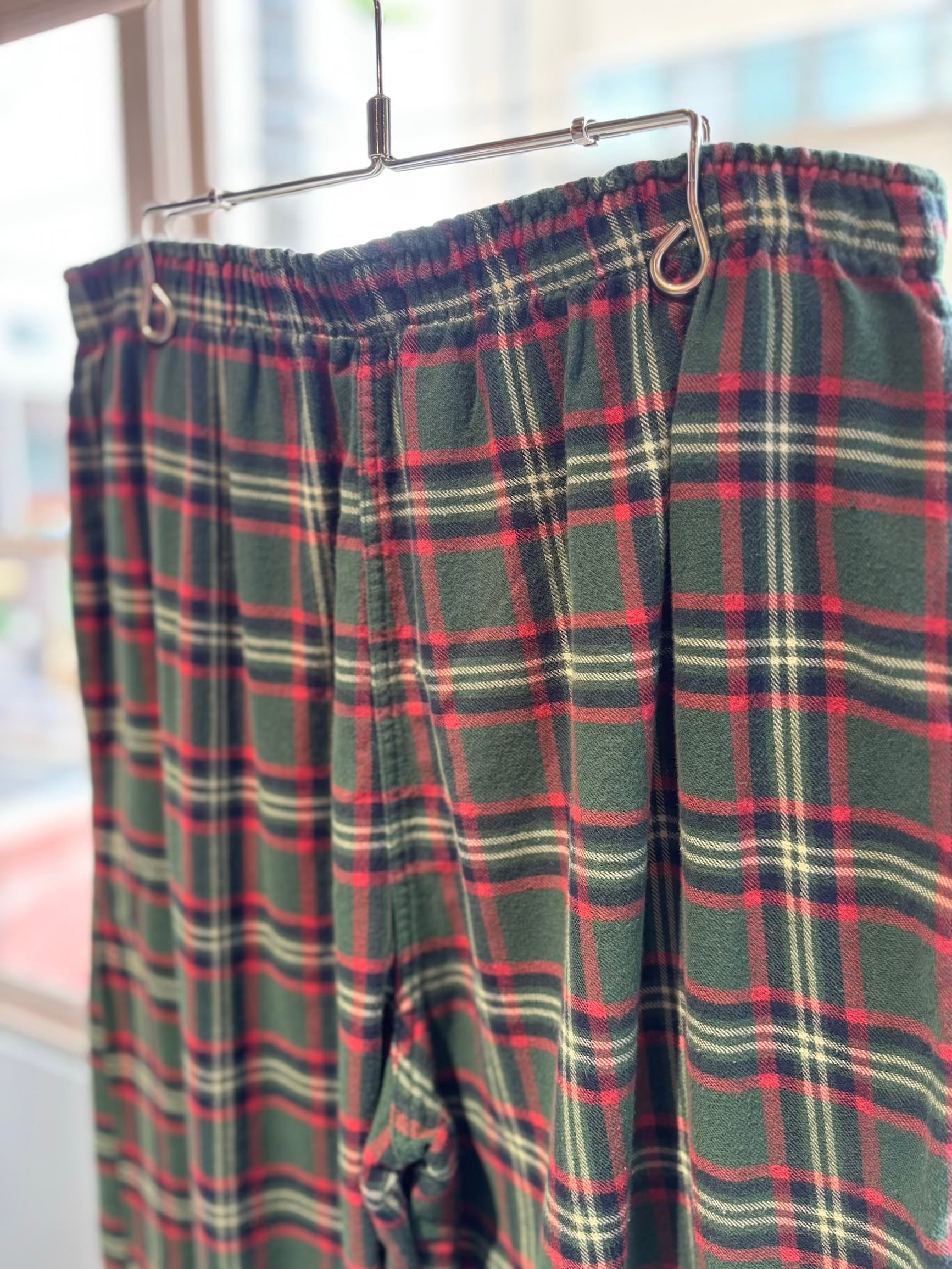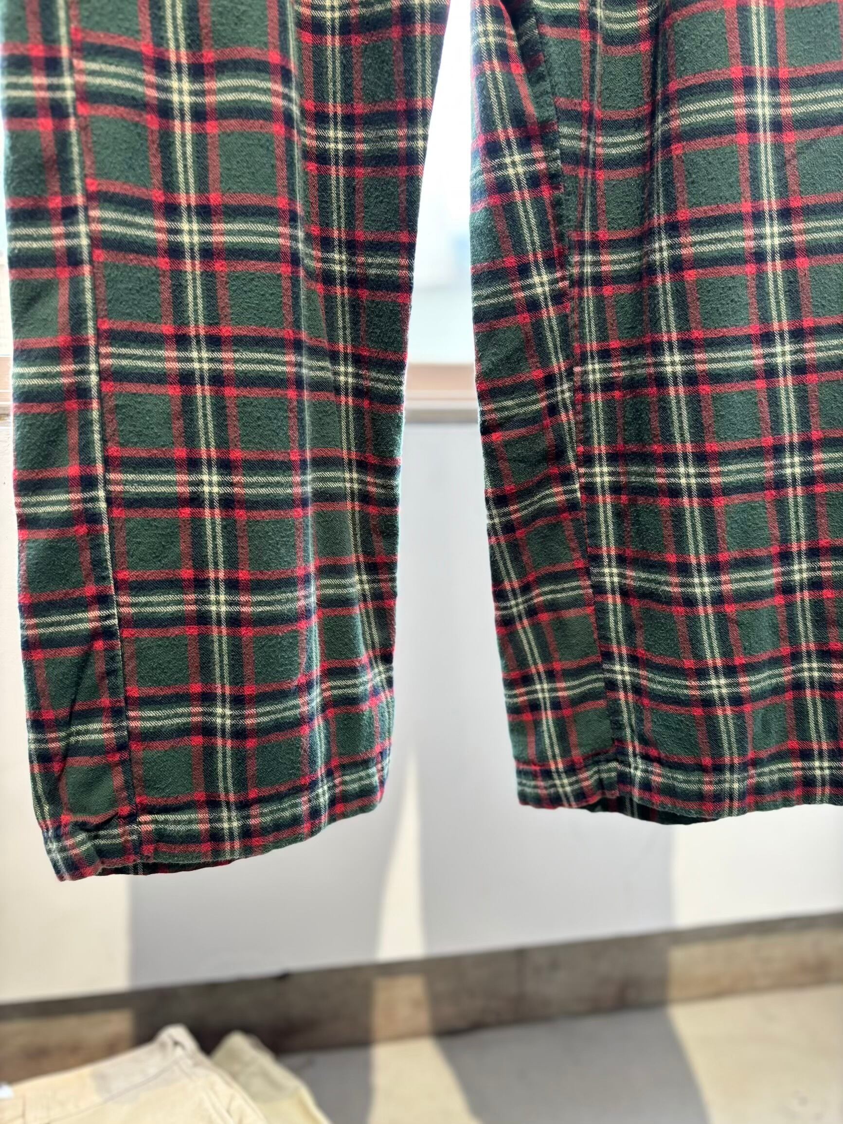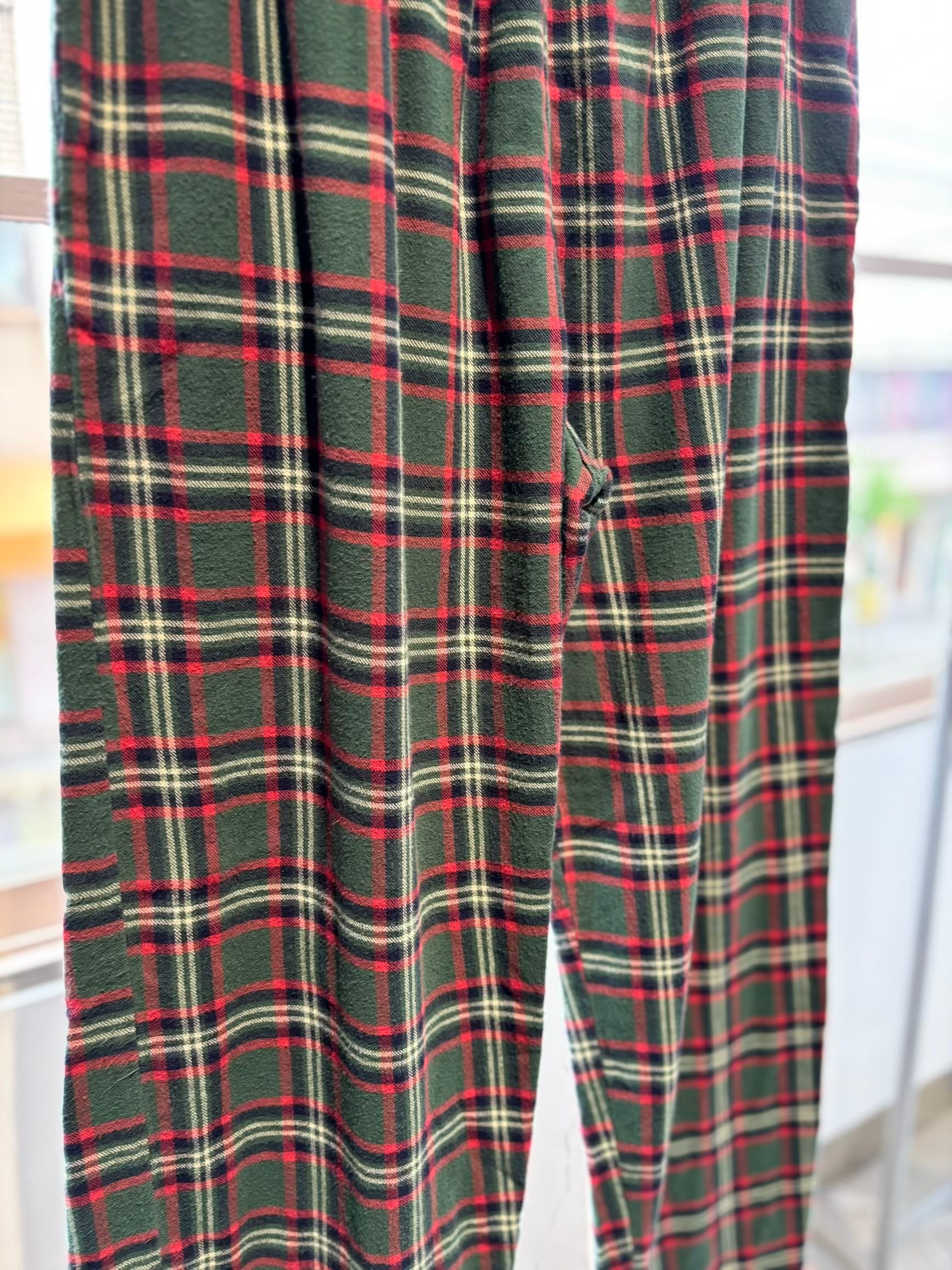 可愛いパンツですね。グリーン×レッド×ネイビー?×ホワイトを基調としたタータンチェックにネルシャツと同じ素材のフランネルコットンの起毛感ある薄手の素材感で、履いていて涼しく履けるパジャマパンツです。