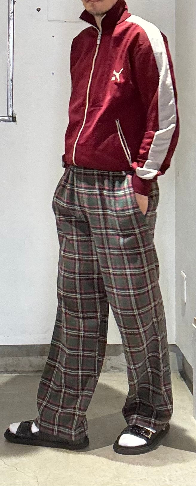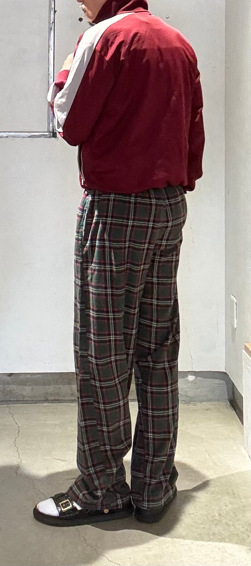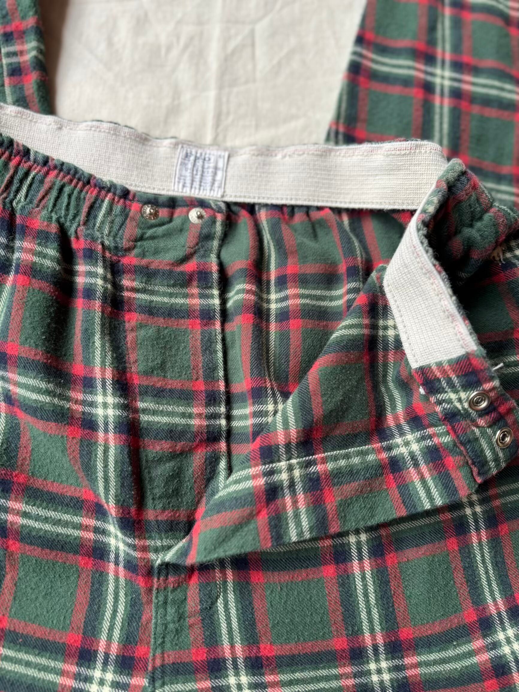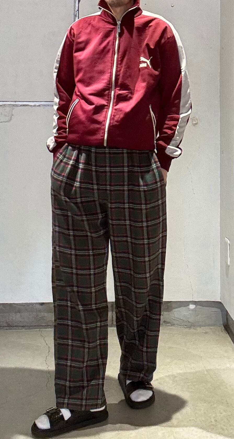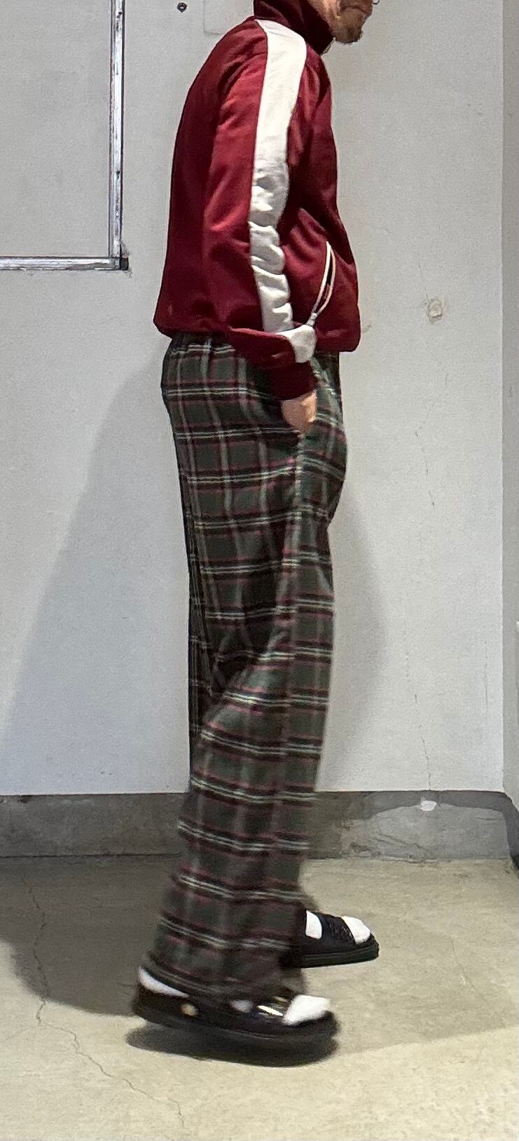 可愛いパンツですね。グリーン×レッド×ネイビー?×ホワイトを基調としたタータンチェックにネルシャツと同じ素材のフランネルコットンの起毛感ある薄手の素材感で、履いていて涼しく履けるパジャマパンツです。