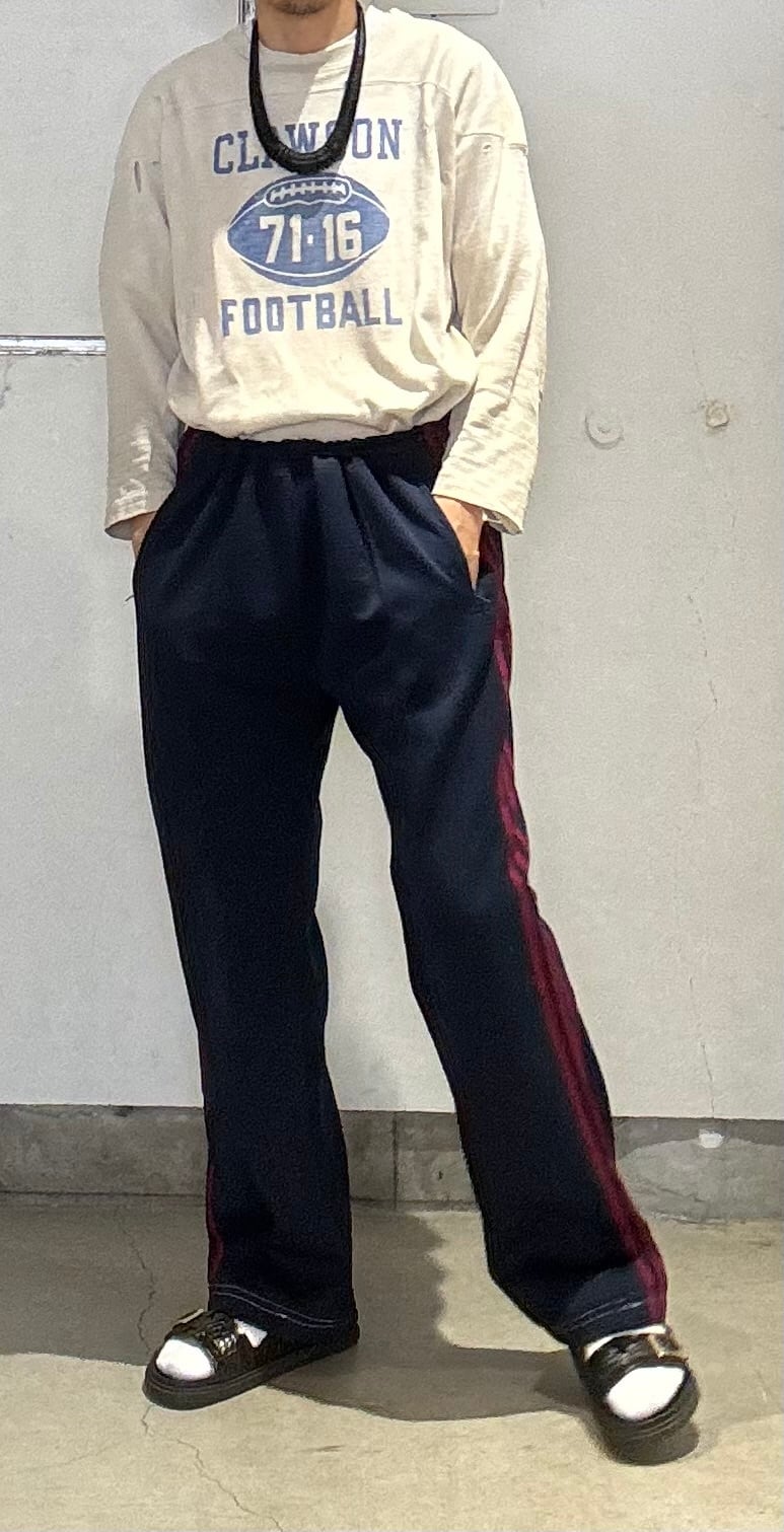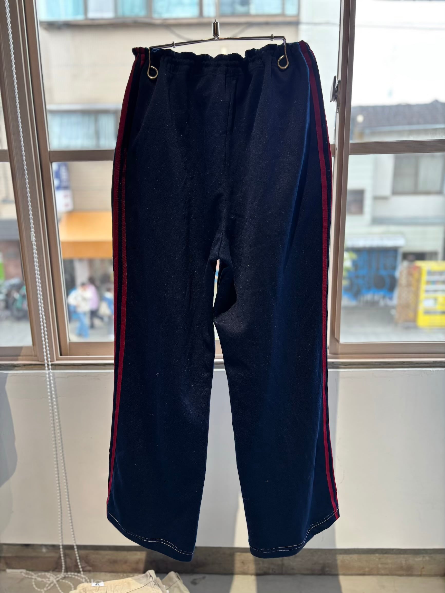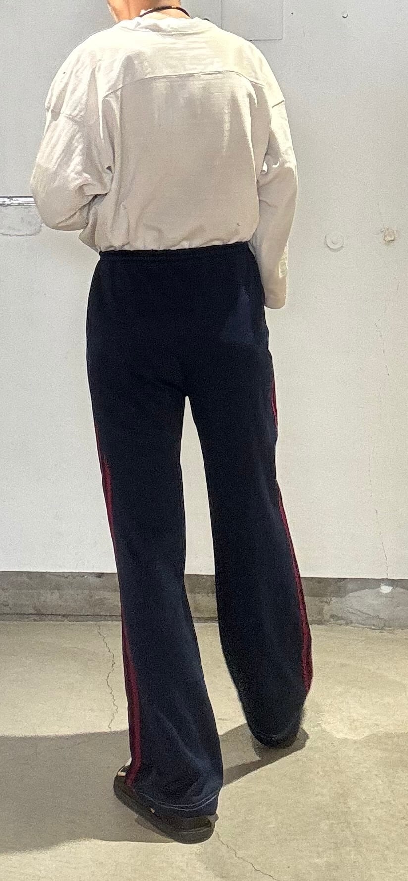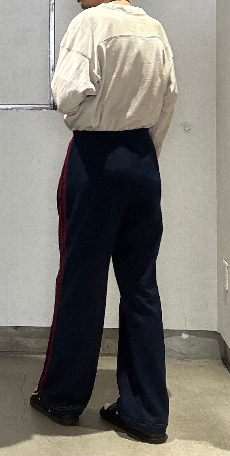 ネイビー×ボルドーのオーセンティックなトラックパンツですが、裾が広く緩いフレアシルエットになった数の少ないディテールのトラックパンツです。サイズが大きめなので全体的にゆったり目に履けるのもいい感じだと思います。