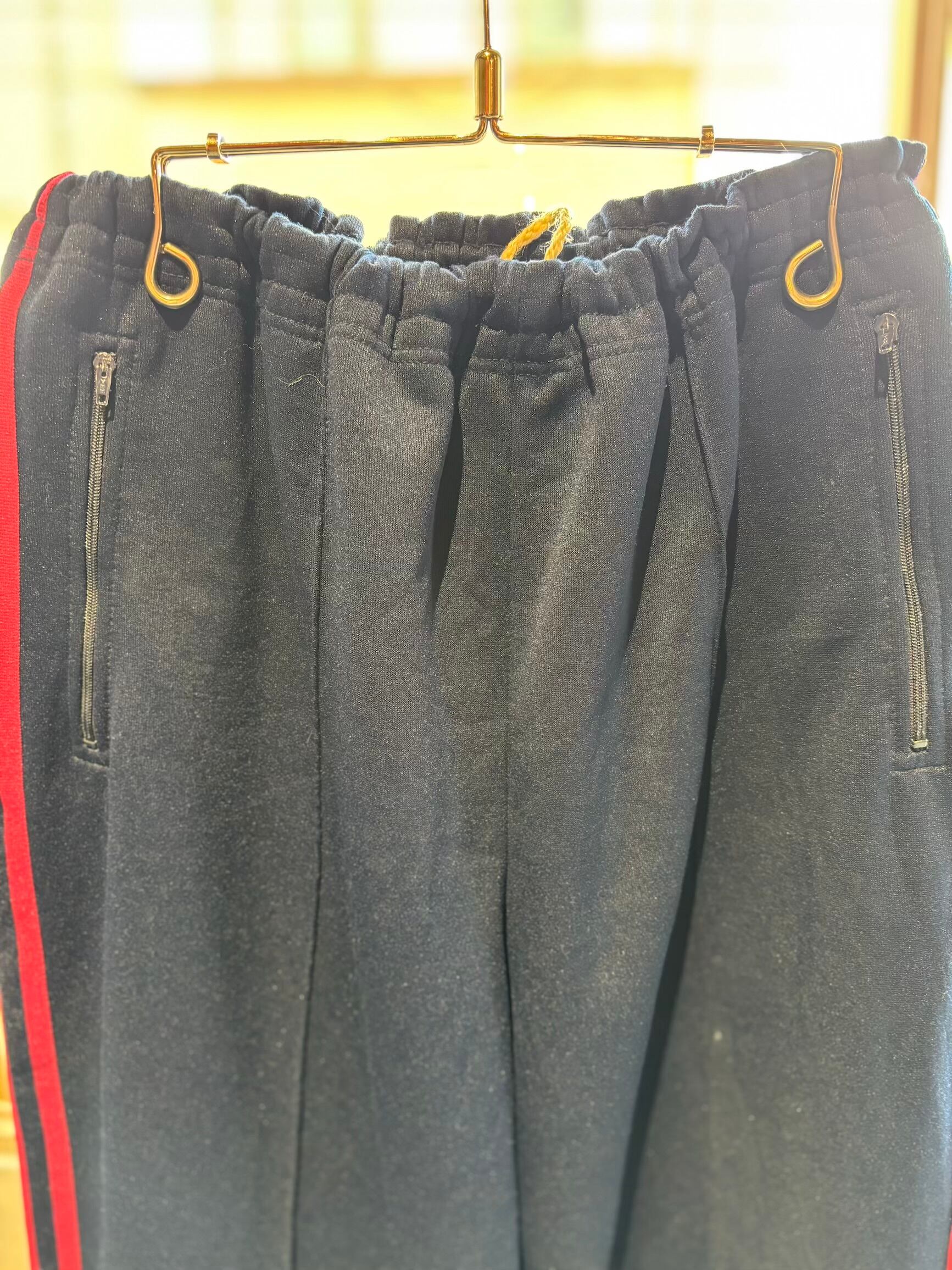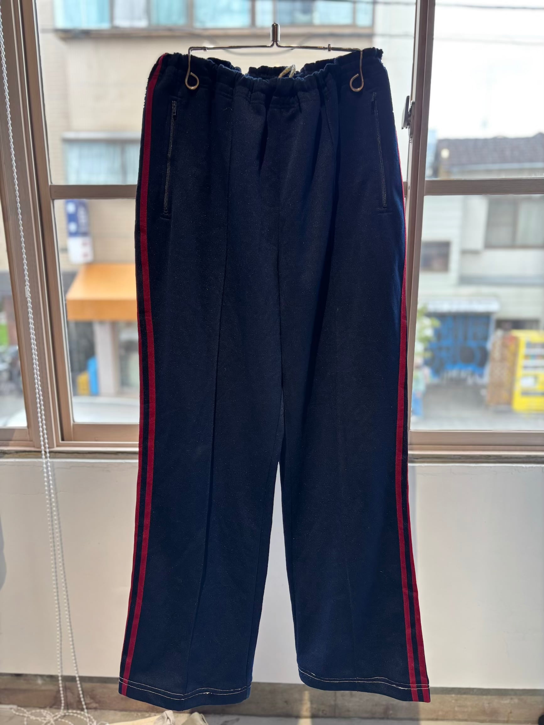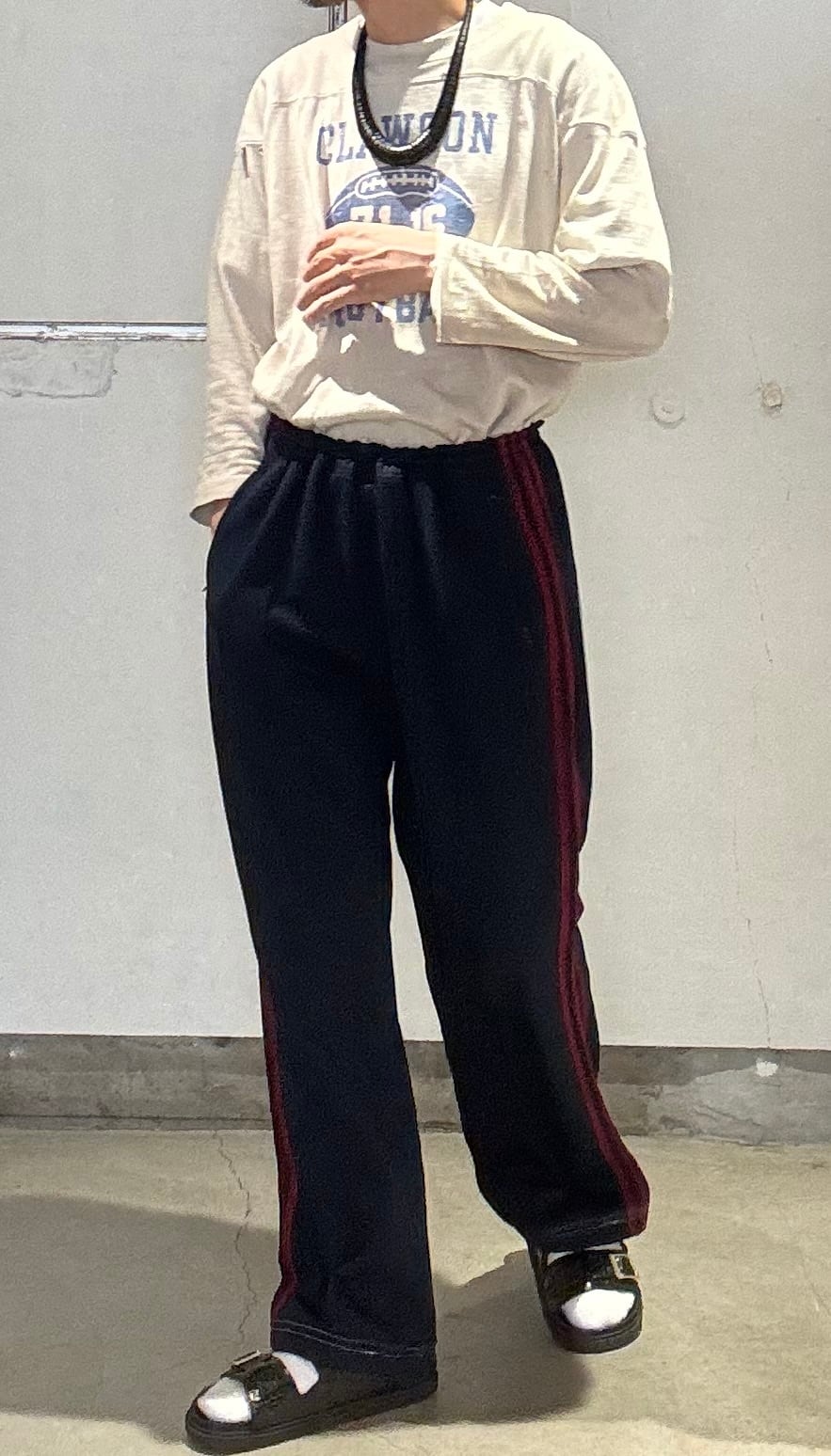 ネイビー×ボルドーのオーセンティックなトラックパンツですが、裾が広く緩いフレアシルエットになった数の少ないディテールのトラックパンツです。サイズが大きめなので全体的にゆったり目に履けるのもいい感じだと思います。