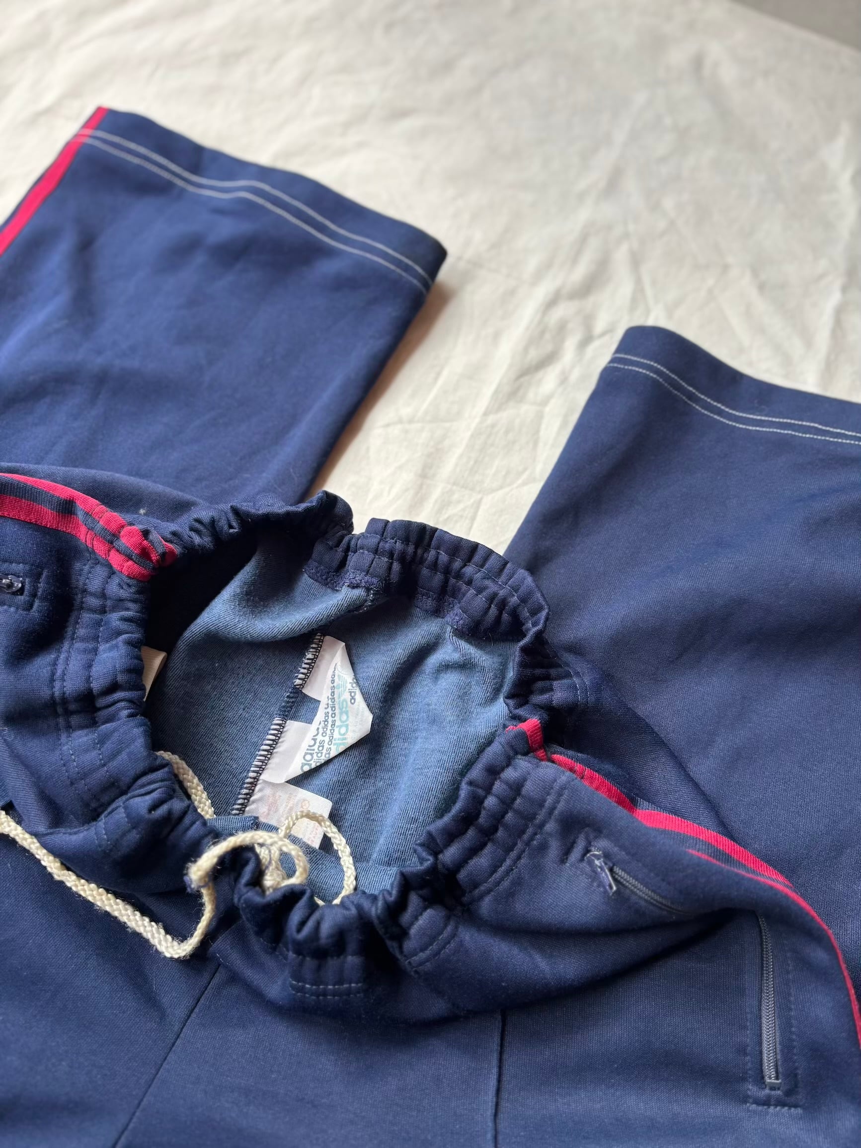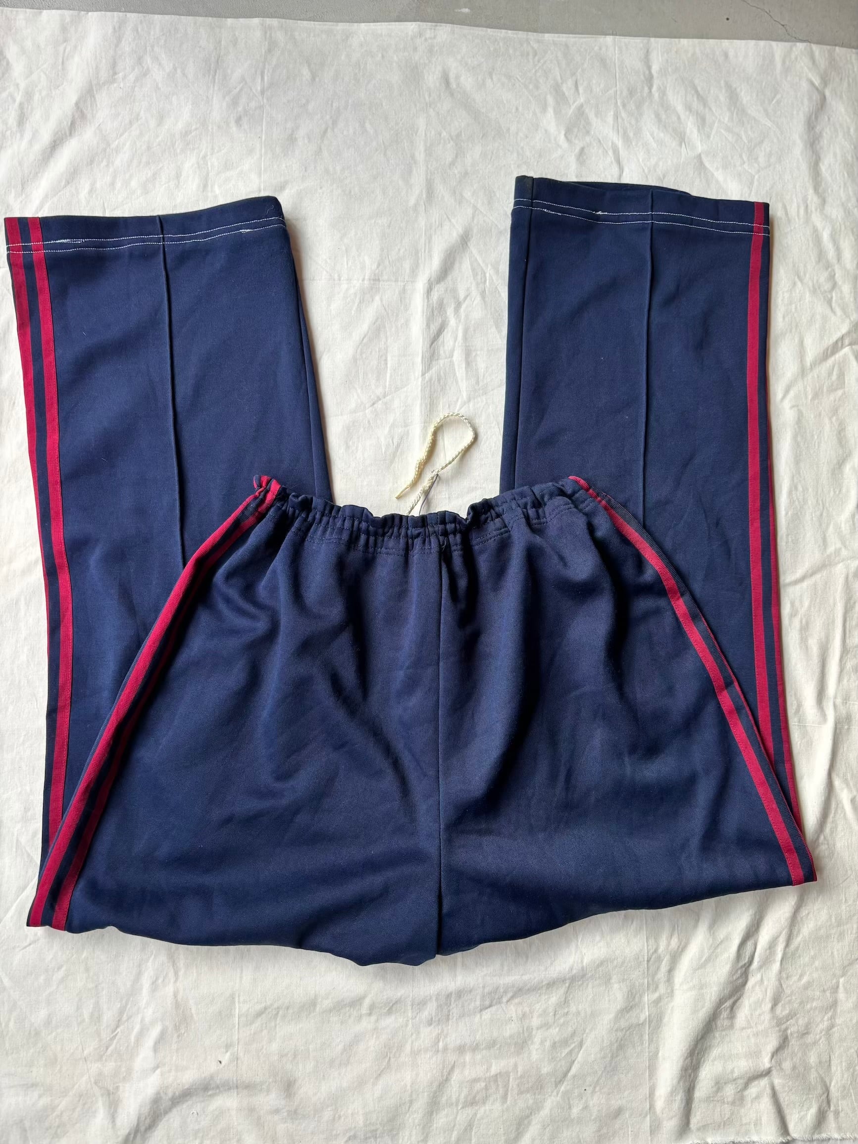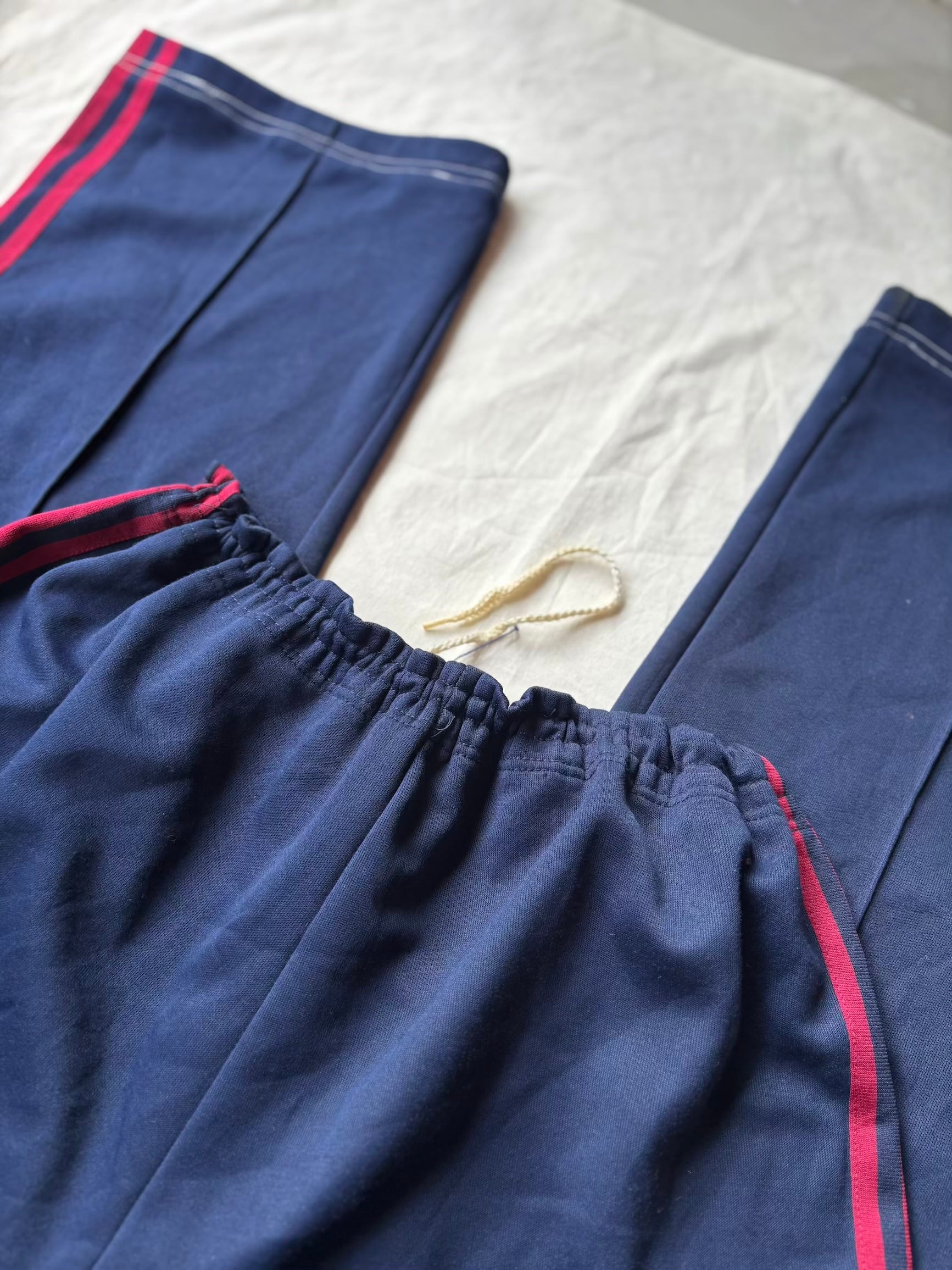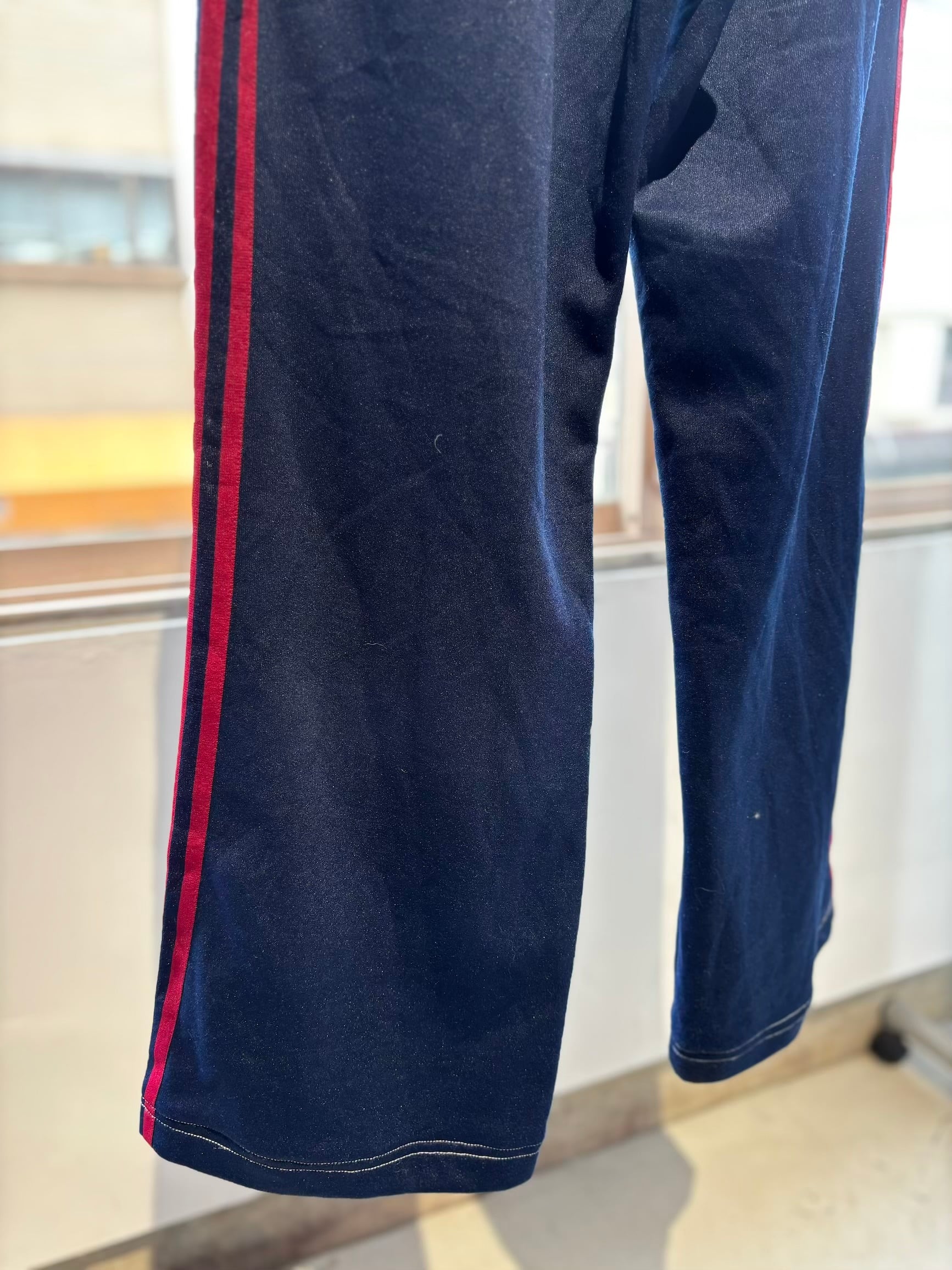 ネイビー×ボルドーのオーセンティックなトラックパンツですが、裾が広く緩いフレアシルエットになった数の少ないディテールのトラックパンツです。サイズが大きめなので全体的にゆったり目に履けるのもいい感じだと思います。