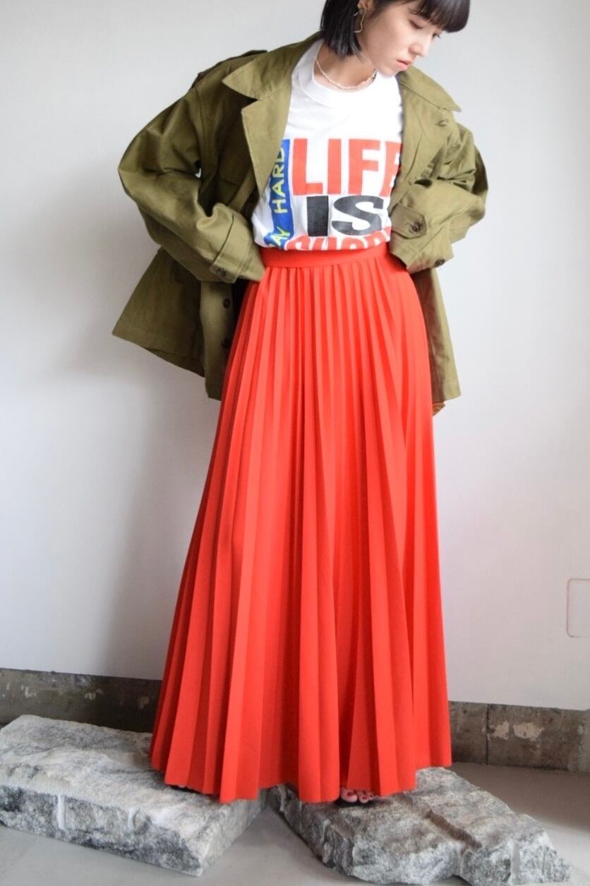 明るい色目が目を引く、オレンジのロングプリーツスカートです。
