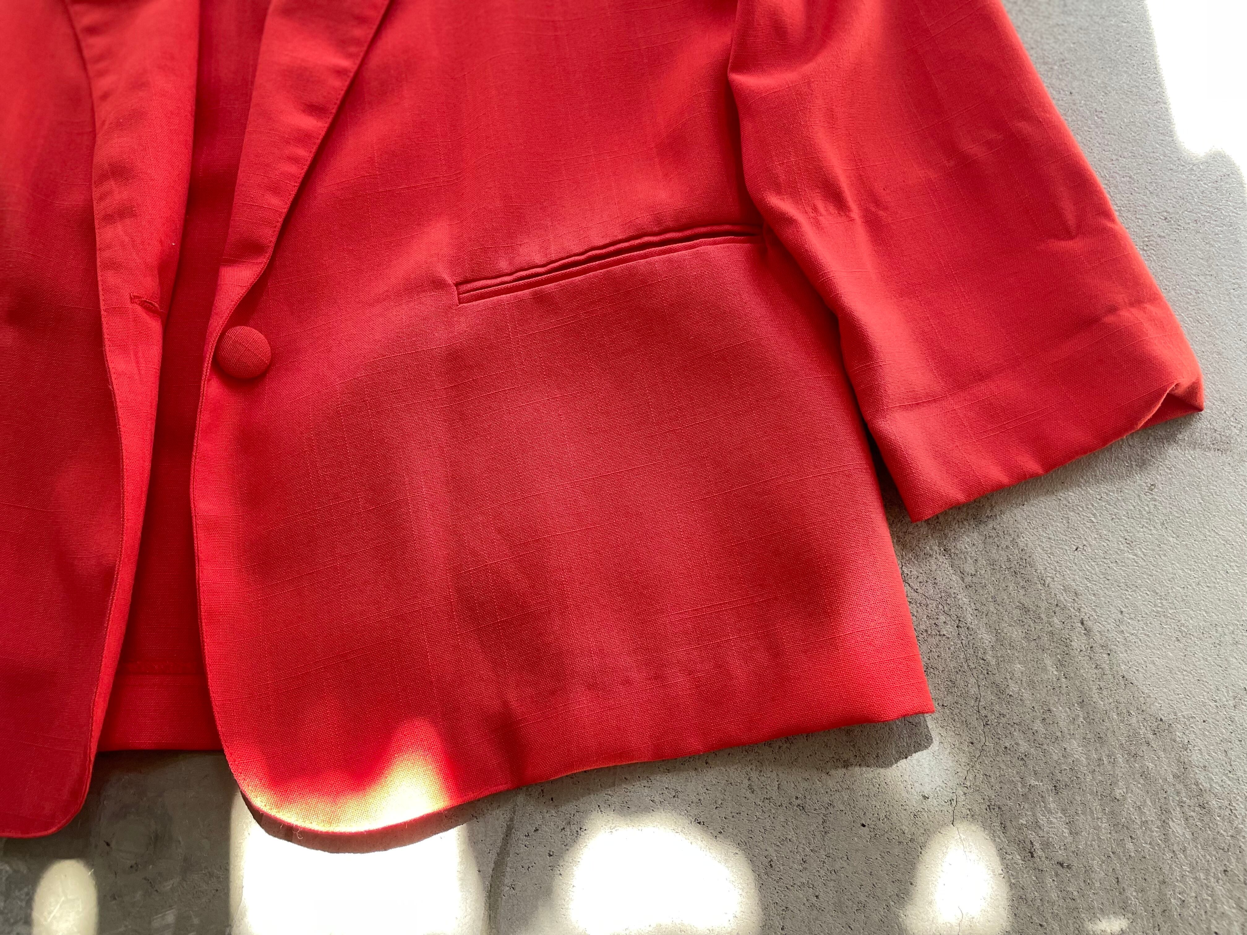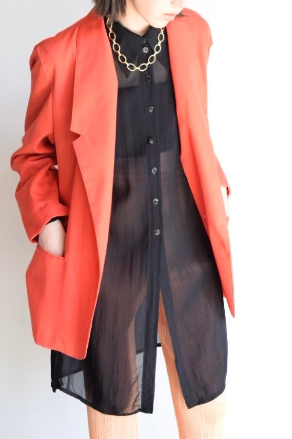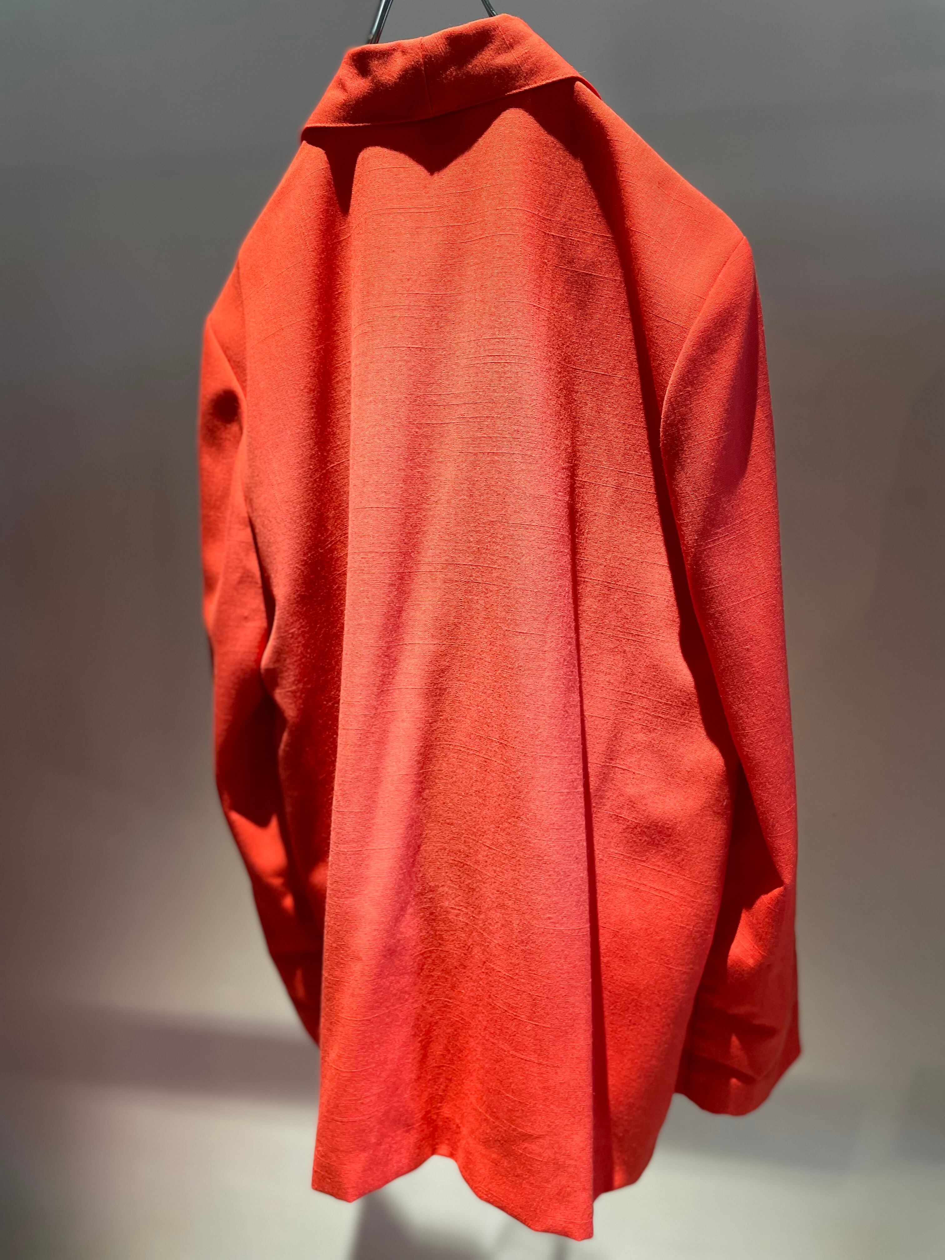 とても綺麗なオレンジのテーラードジャケットで、着丈も長くユニセックスで使えるジャケットになります。