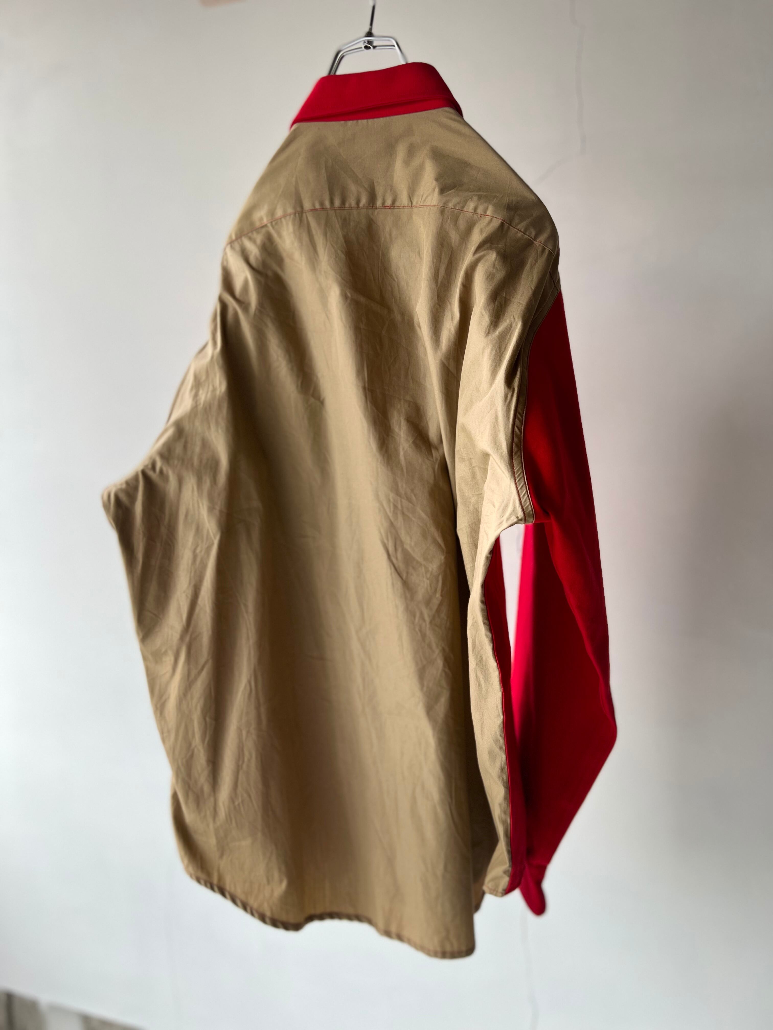 表地が赤のダック生地で、背面がベージュのポプリンになっている、非常に変わったデザインです。