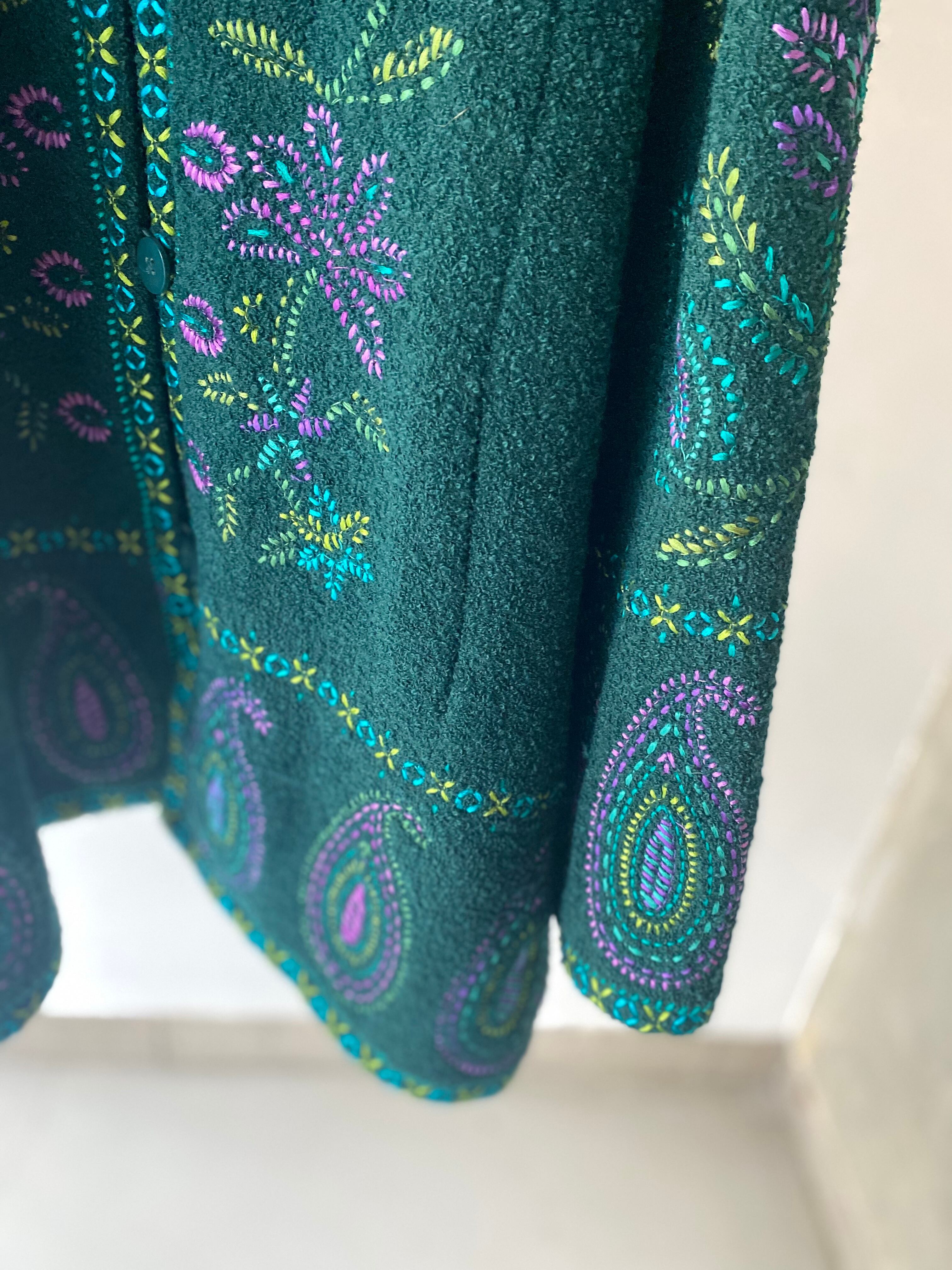 表生地はタオル生地のような凹凸のあるウール×レーヨンの生地で、綺麗なパープルやグリーンの刺繍が施されています。