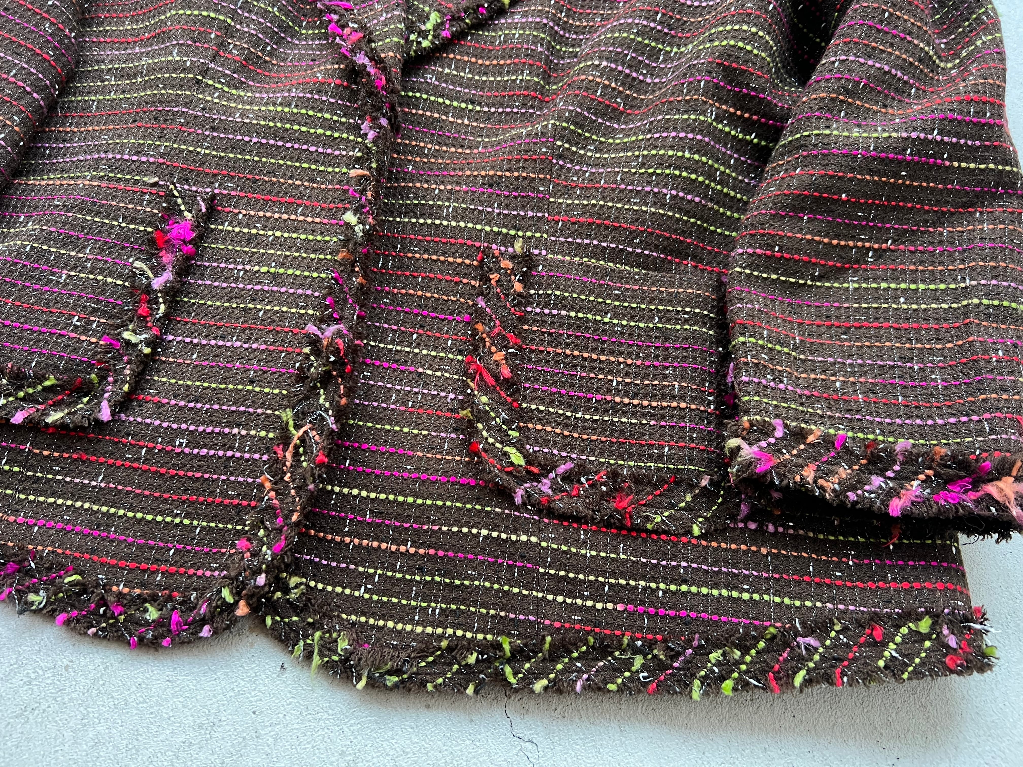 ブラウン基調の生地にグリーン、ピンク、レッドで織られた大変綺麗な織り感のジャケットです。