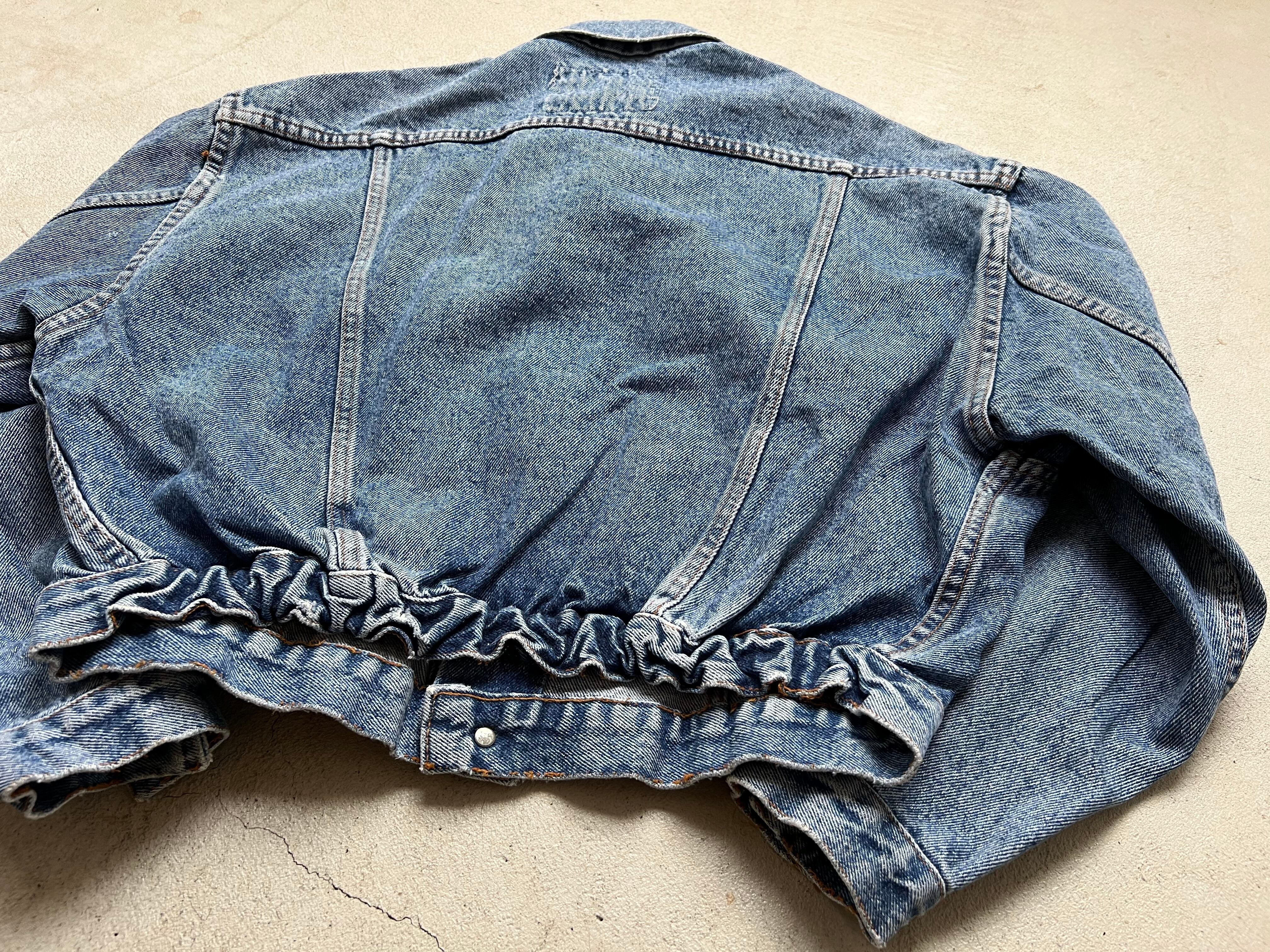かなり極端に絞られたウエストと着丈、かなり幅の広い肩幅と身幅により、80年代感満載なディテールとなっています。