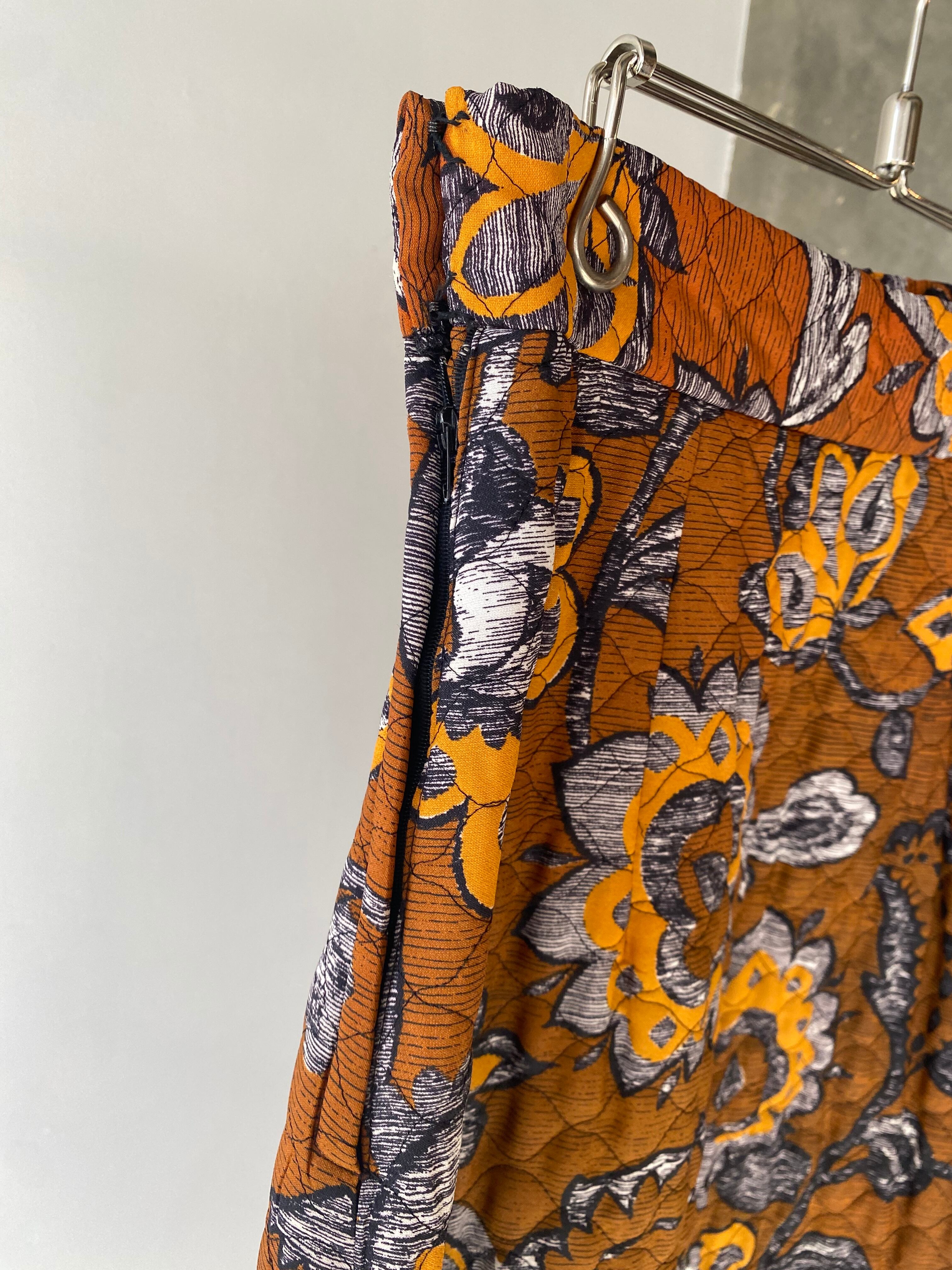 大ぶりな柄に茶色ベースのキルティングがとても印象的なスカートです。