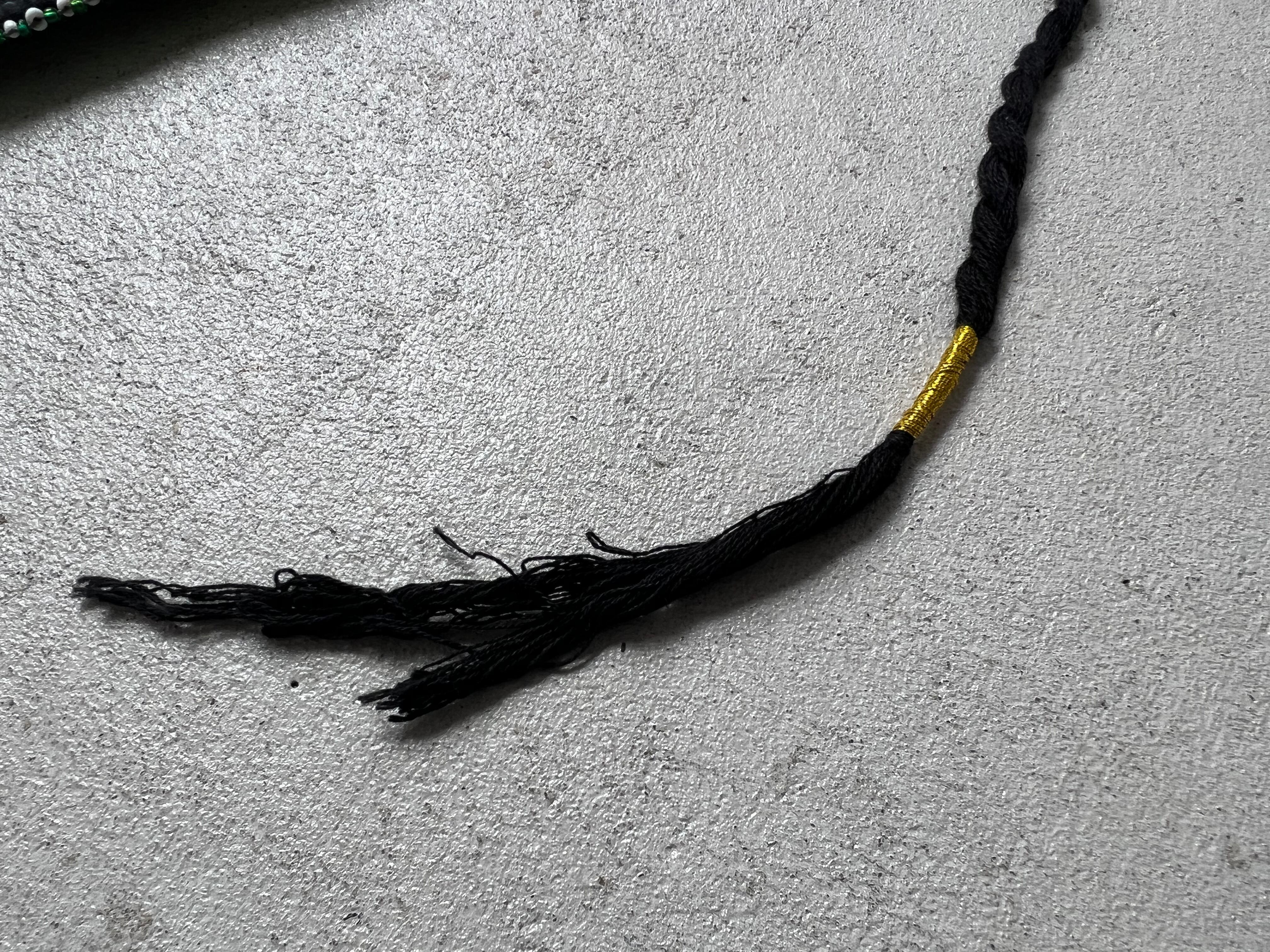 古いコインやビーズ、シルバーのヤマミチテープの装飾が華やかなアイテムです。