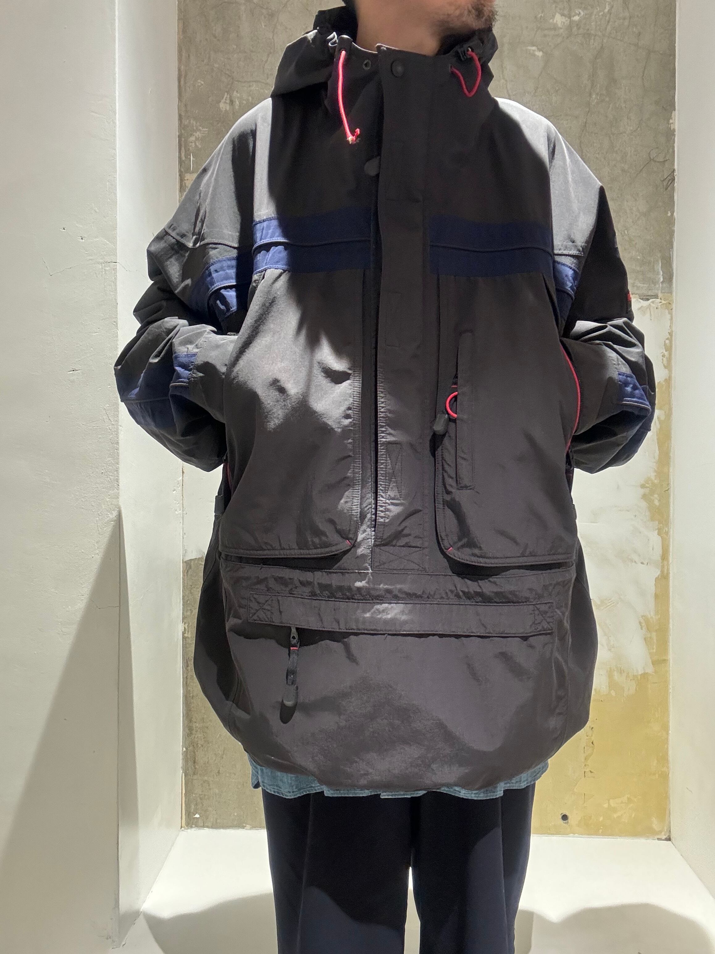 胸に大きなポケットが二つ、アノラックらしいお腹にもポケットが付きます。また脇下にはベンチレーション、裾や首周りには風避けの為のドローコードが付く、とても機能的なアイテムです。