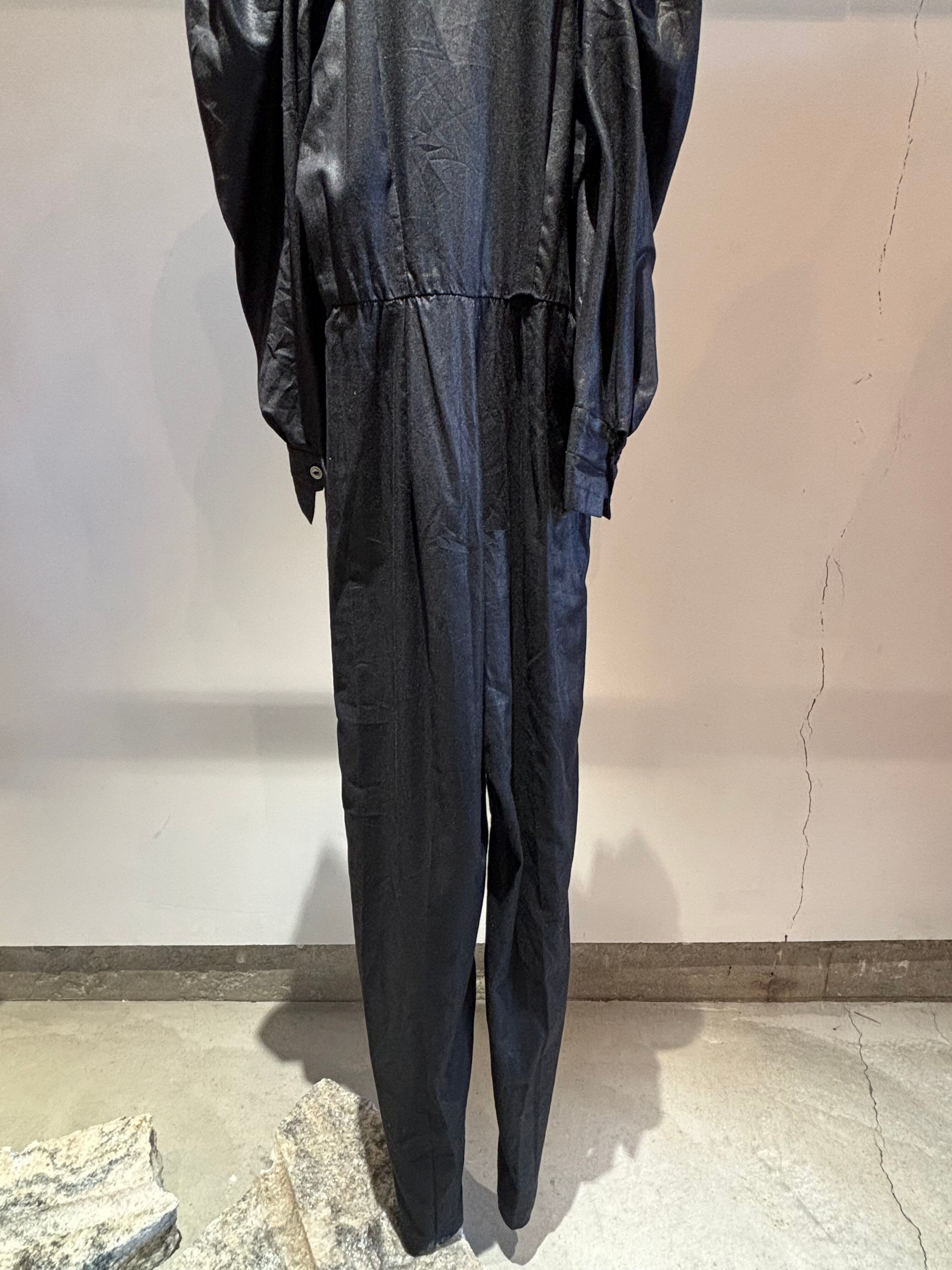 襟元がフリルになっていて、Vネックにフロントボタン、肩はパフショルダーになっていて、独特のシルエットで大変珍しいジャンプスーツです。