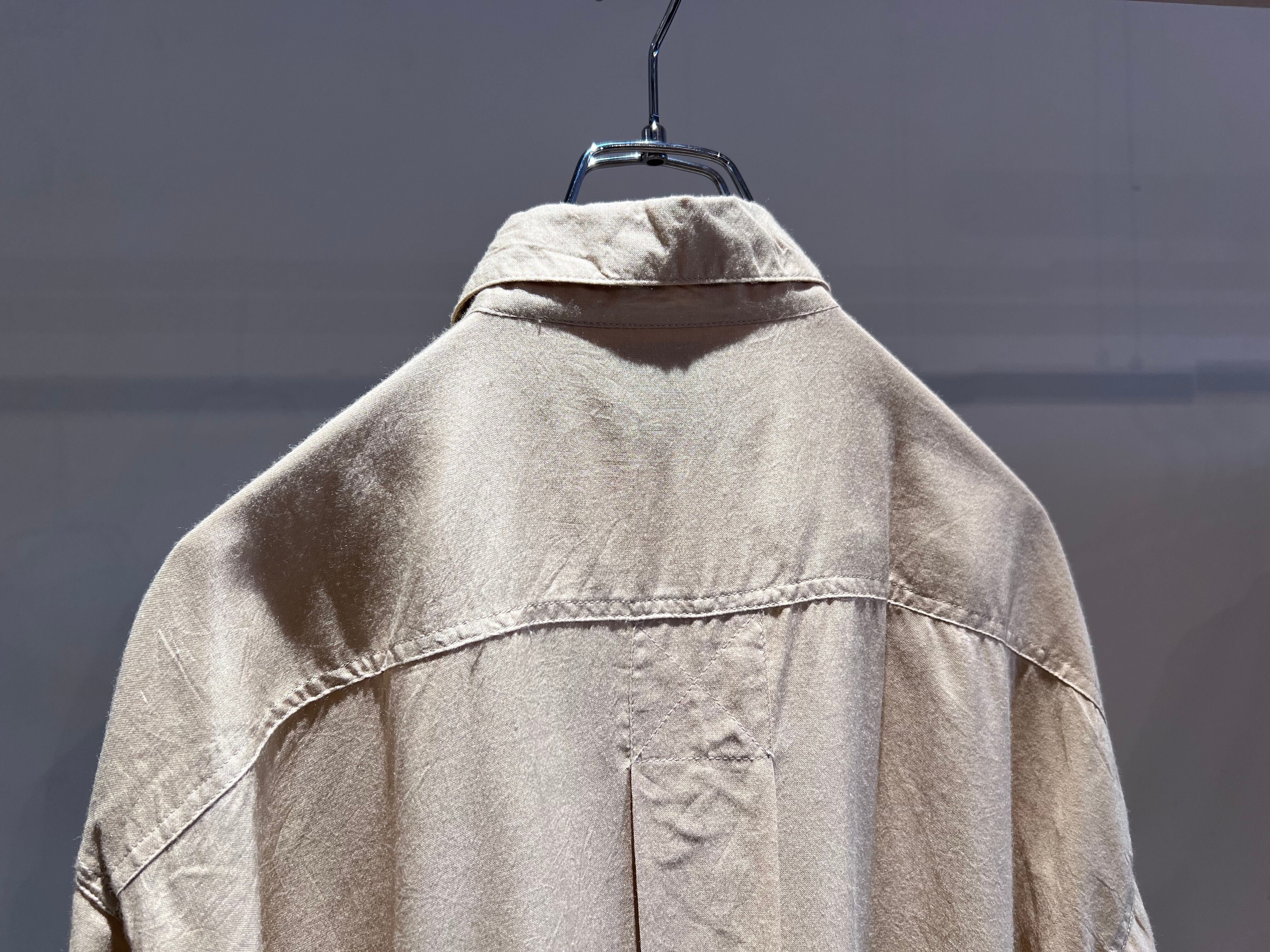 カラーは少し明るめのベージュで、少し光沢があります。上品な生地に対して、胸にビッグポケットをつけることによって、カジュアルな雰囲気でも着られるようデザインされています。