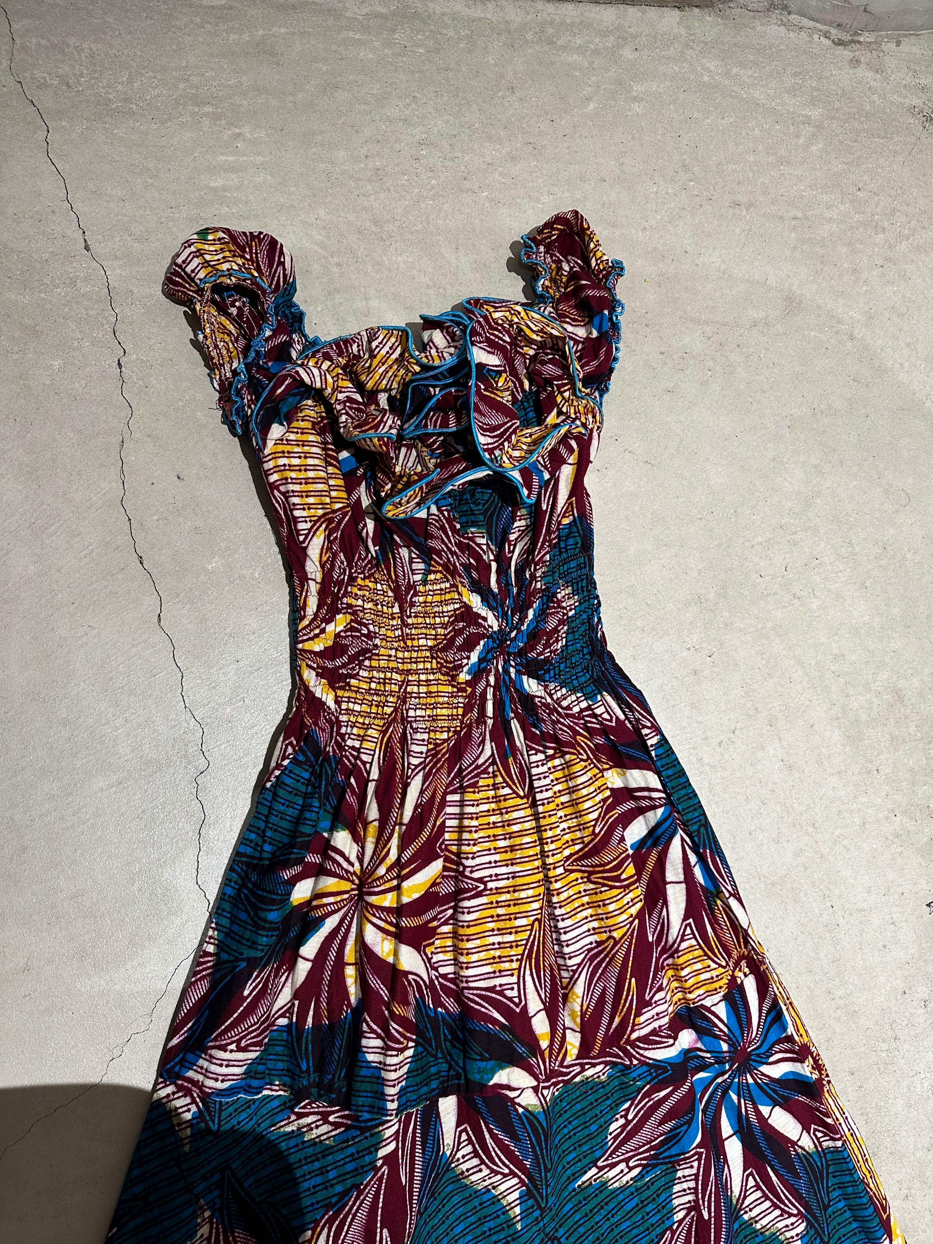 胸元にふんだんにあしらわれたフリルや、派手すぎず地味すぎない配色、裾や袖の青いパイピングなど、
