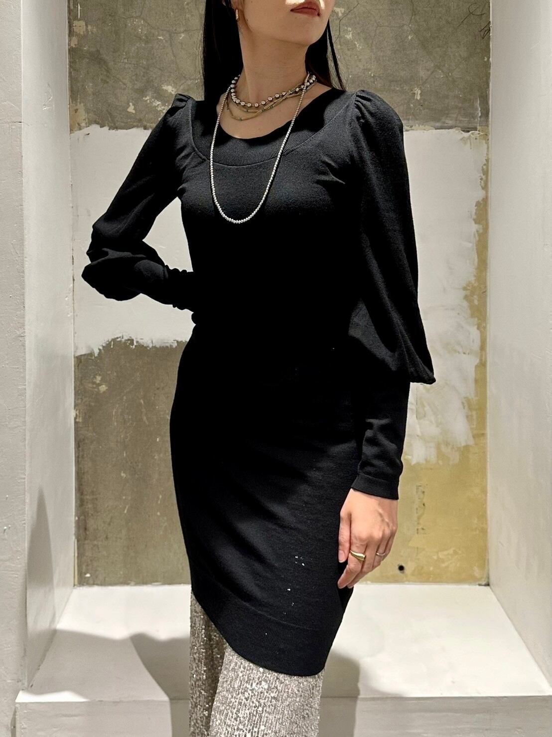 ハイゲージのニットドレスですが、超上質なメリノウールで作られている為、質感がシルクの様な滑らかさです。