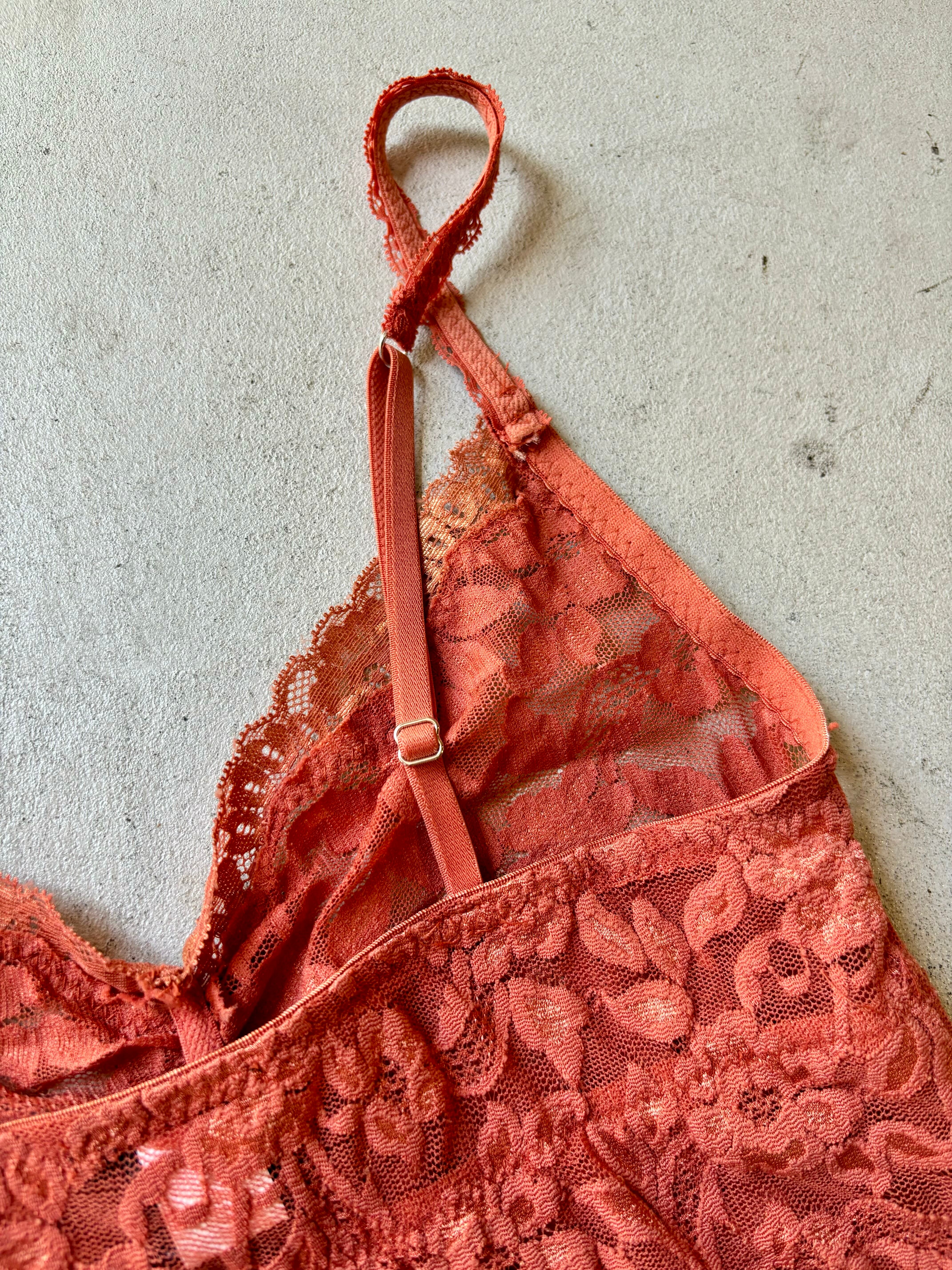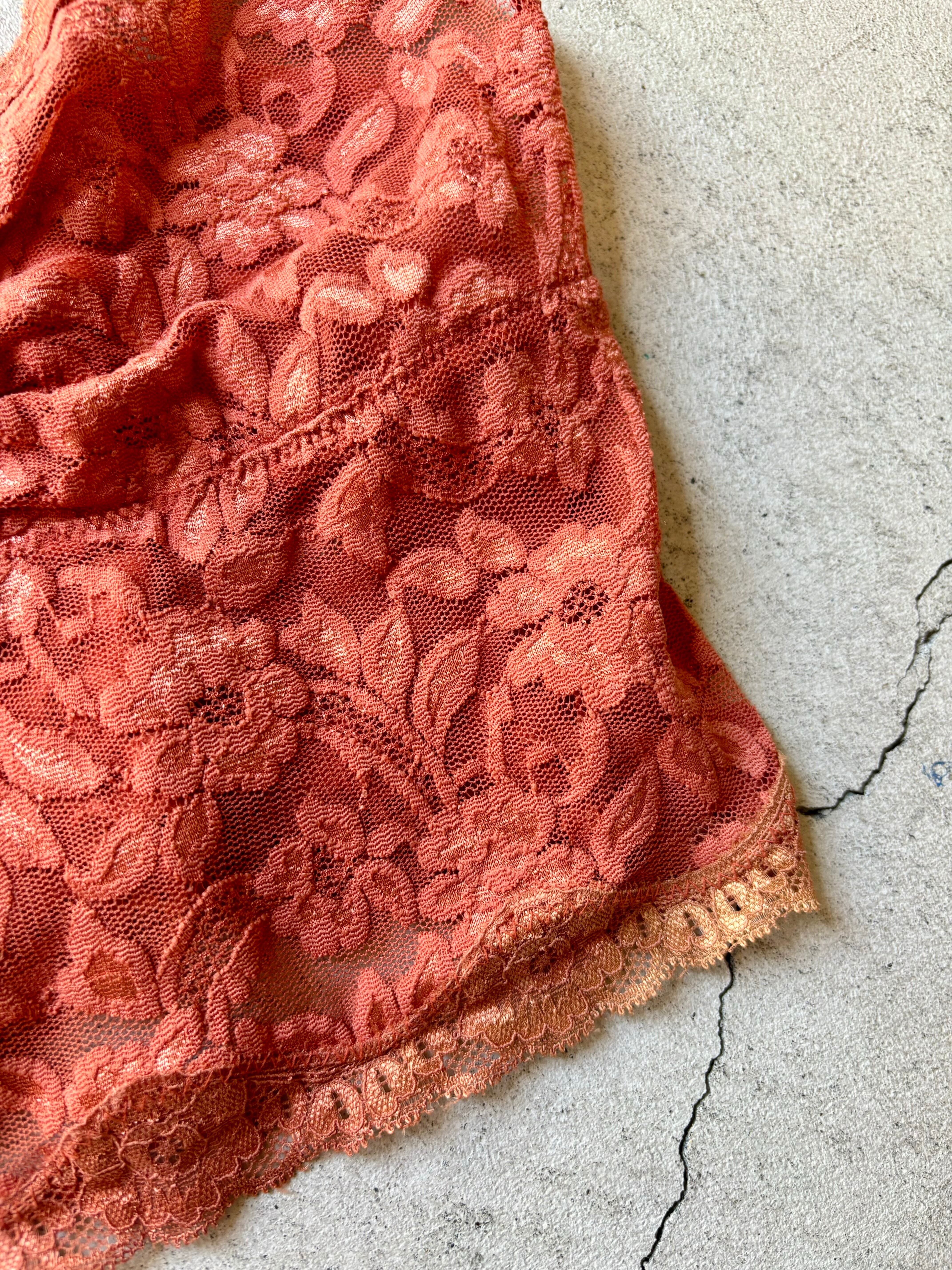可愛いオレンジとピンクの中間の様な色と、甘くなりすぎないレースのバランスがとても使いやすいアイテムだと思います。