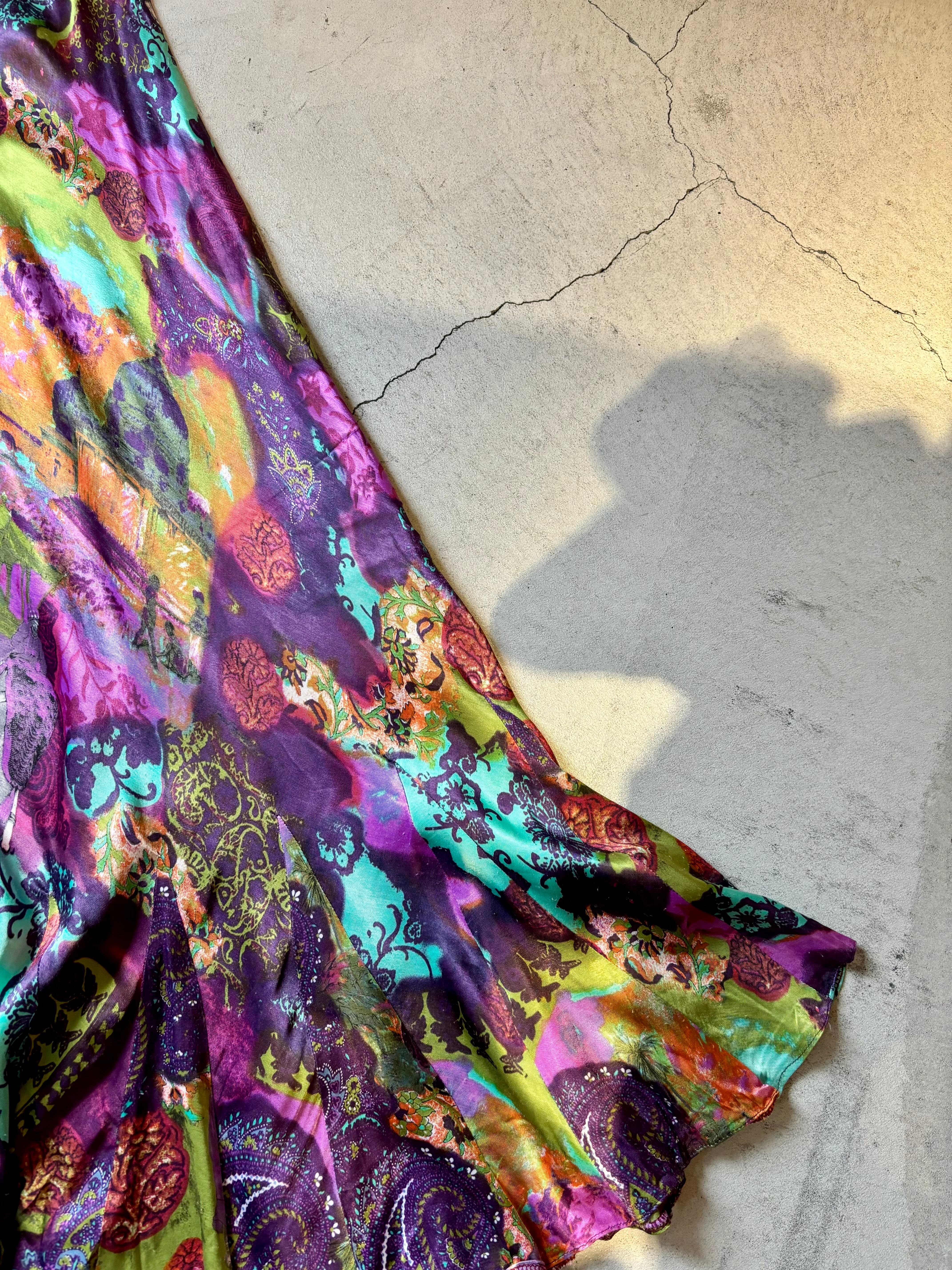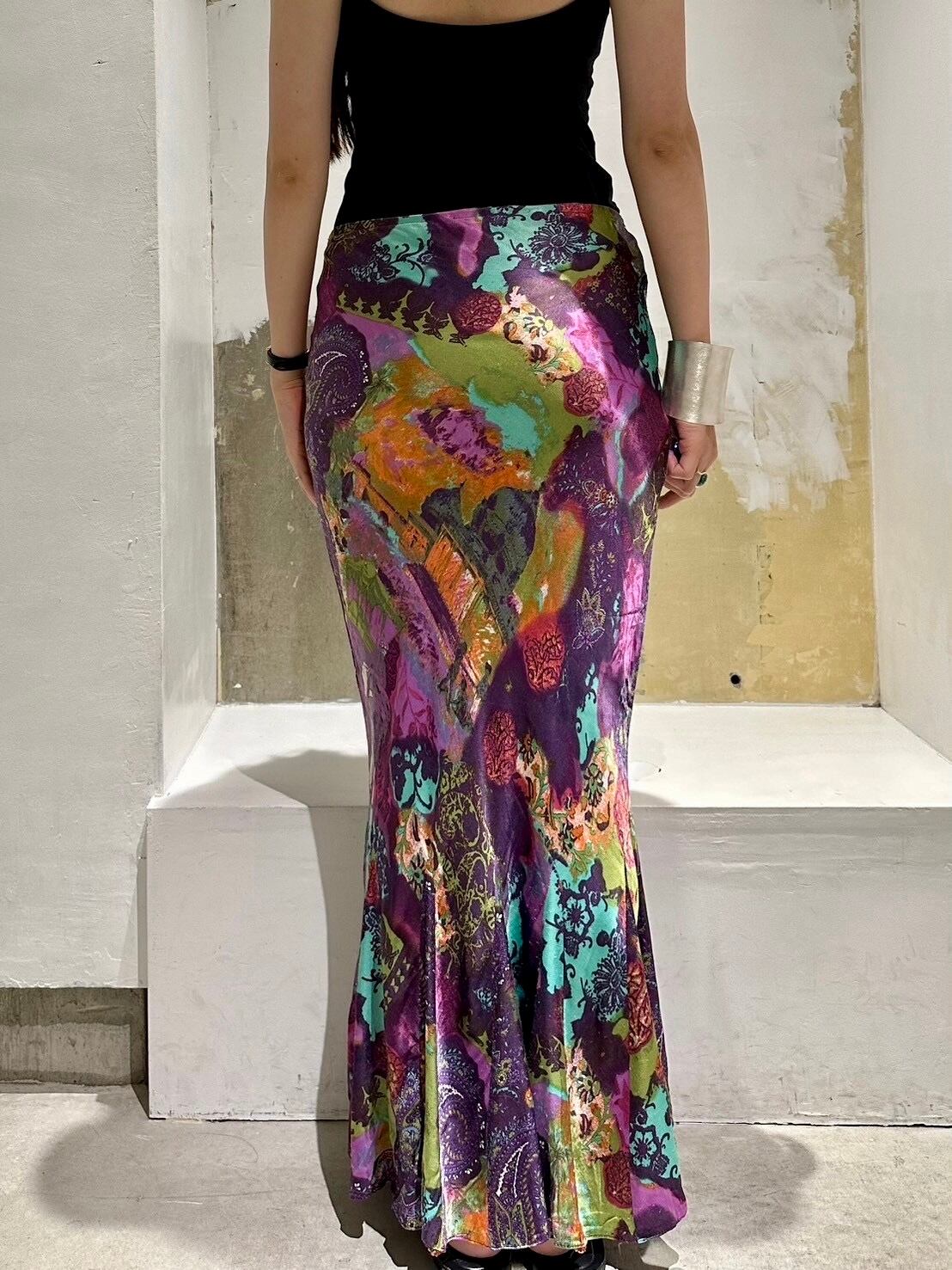 サイケデリックな総柄のマーメイド型で伸縮性がありシルエットが綺麗に出る素敵なスカートだと思います。