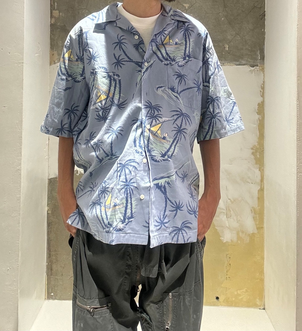 ブルーベースに椰子の木や船に乗っている人がいるガラガラ入っているの夏を思わせるシャツです。