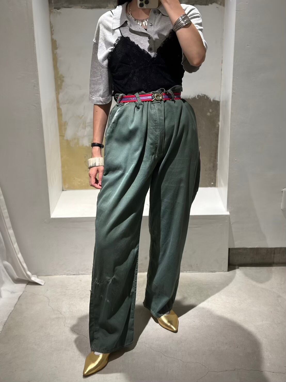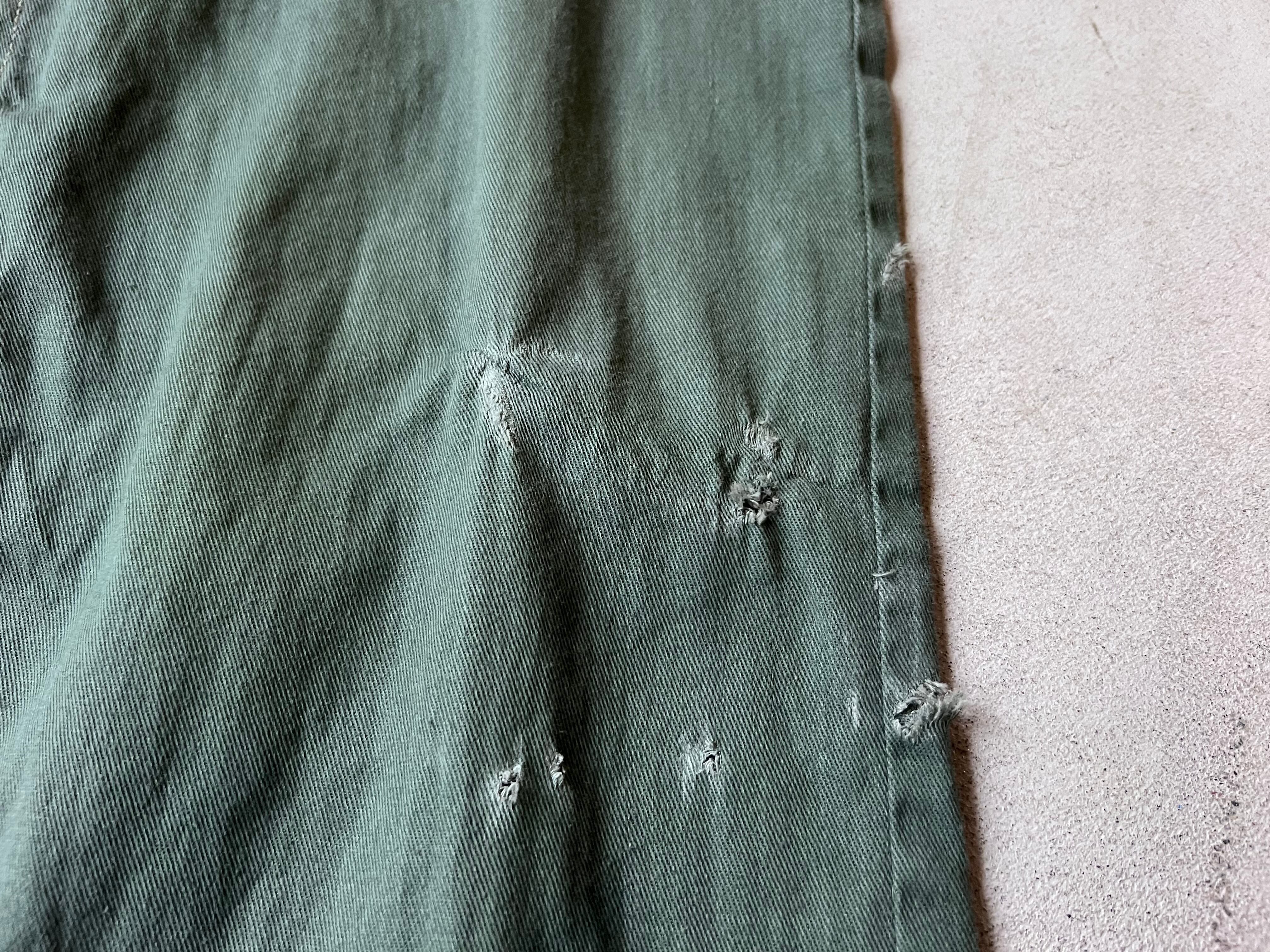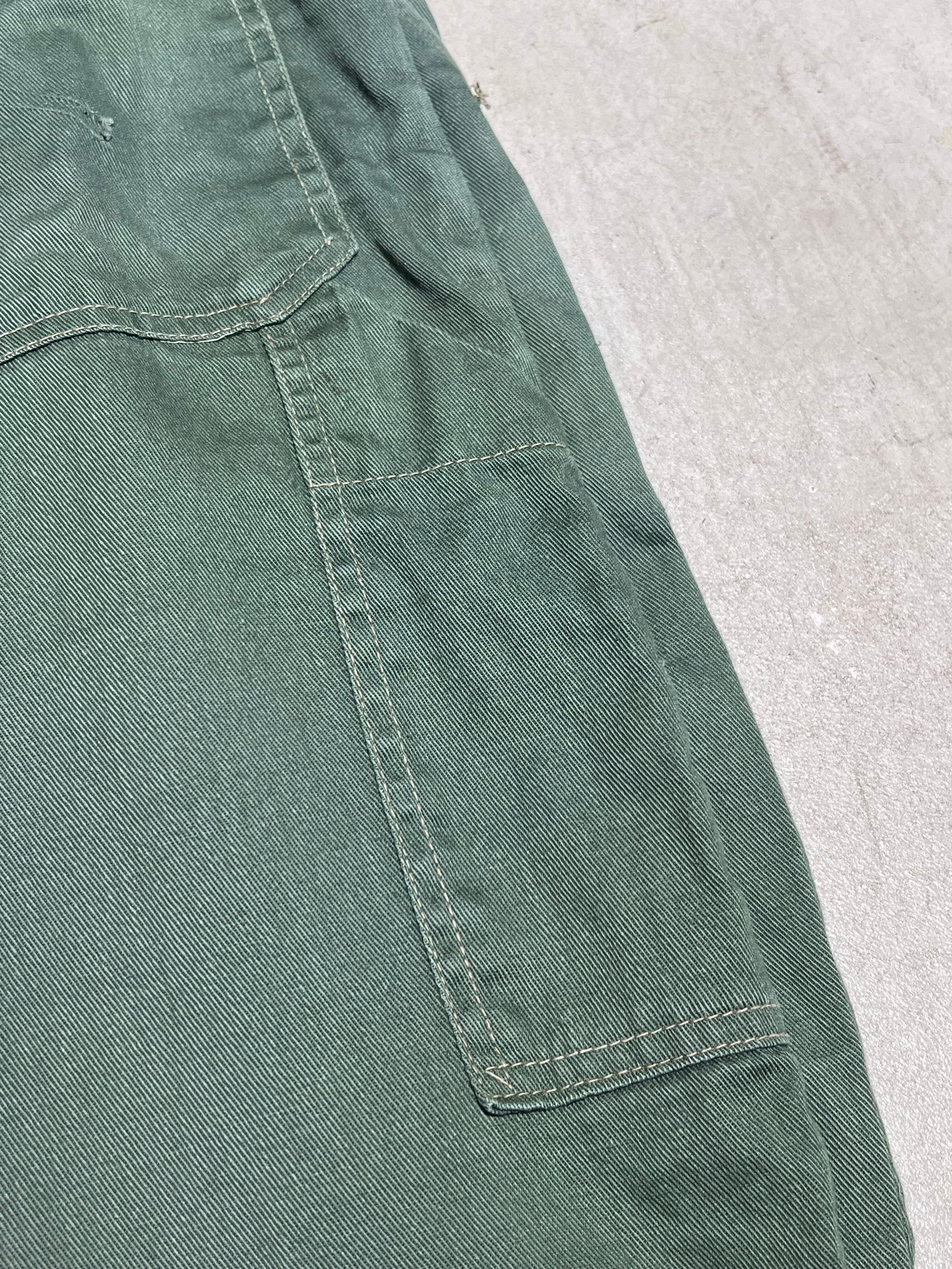 珍しいグリーンのコットンツイルのワークパンツです。右足にペンポケットがあり、