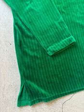 とても発色の良いグリーンにストライプの織りのあるカットソーで、裏地はポリエステルなのでサラッとしていてとても着やすいです。