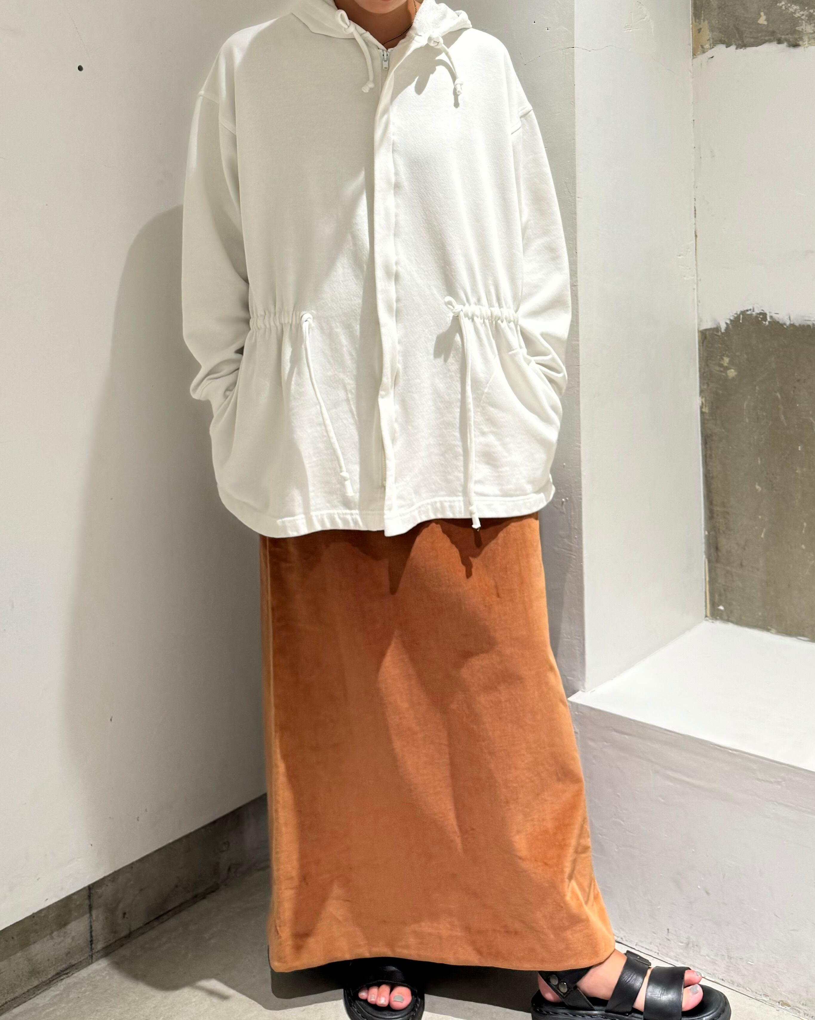 こちらのアイテムはオーバーサイズのスウェットフーディです。なんの変哲もなさそうなアイテムですが、前開きfull zipにに比翼(シャツのフロントなどについているボタンなどを隠すもので、エレガントでフォーマルな印象を与えます)をあえて付けたりですとか、腰部分にdraw cordを付ける、というような凝った作りになっています。裏地も起毛ではなく天竺です。