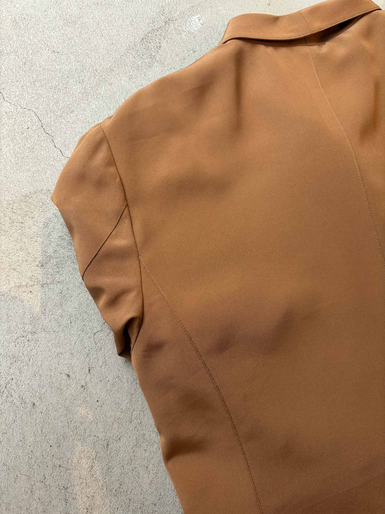 光沢のあるブラウンのダブルのジャケットですが、裾のカッティングが珍しく、菱形のカットになっていて可愛いディテールです。
