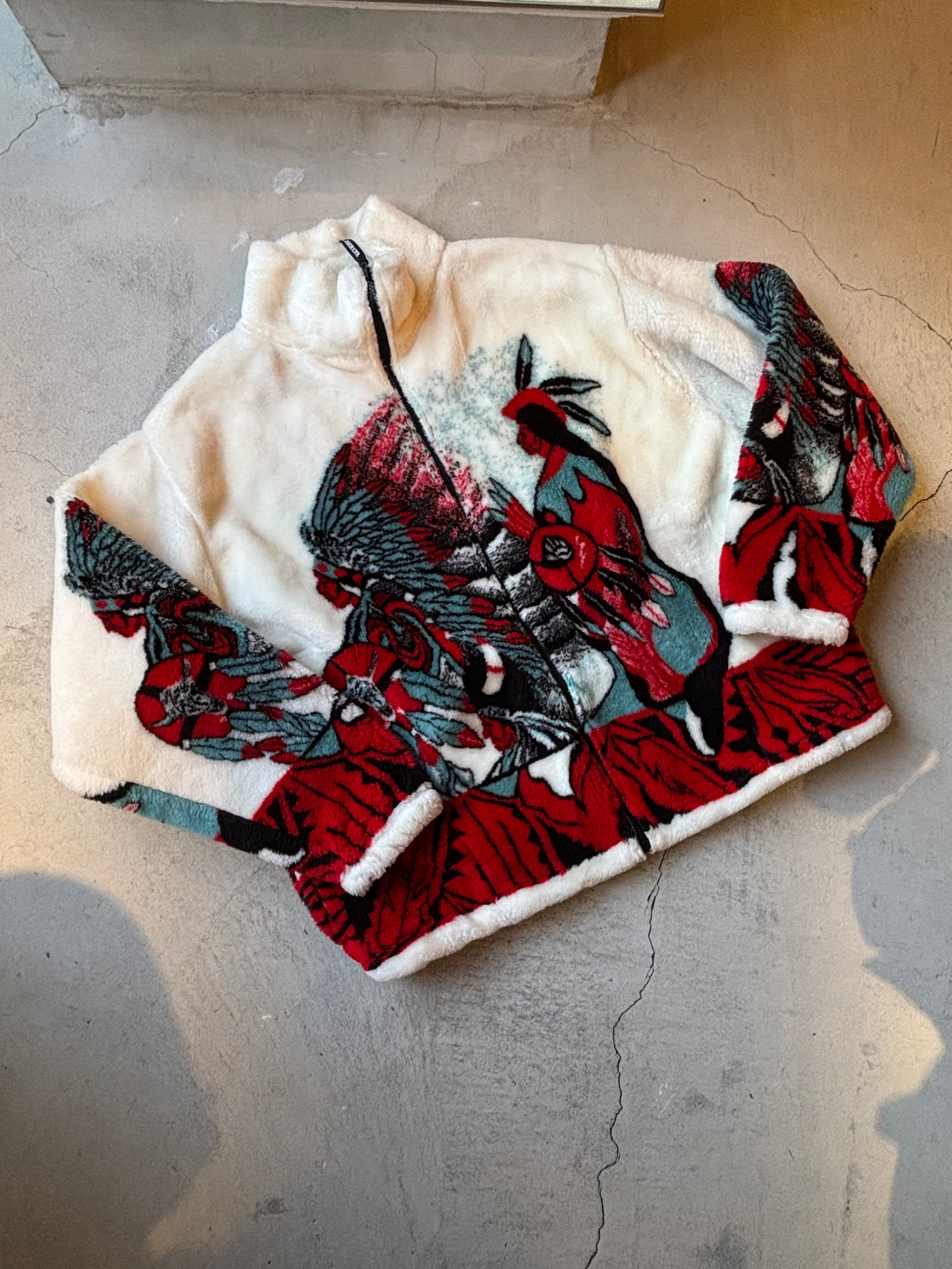 恐らくこの手のジャケットでは動物柄が多いと思いますが、こちらは大変珍しいインディアン柄のフリースです。