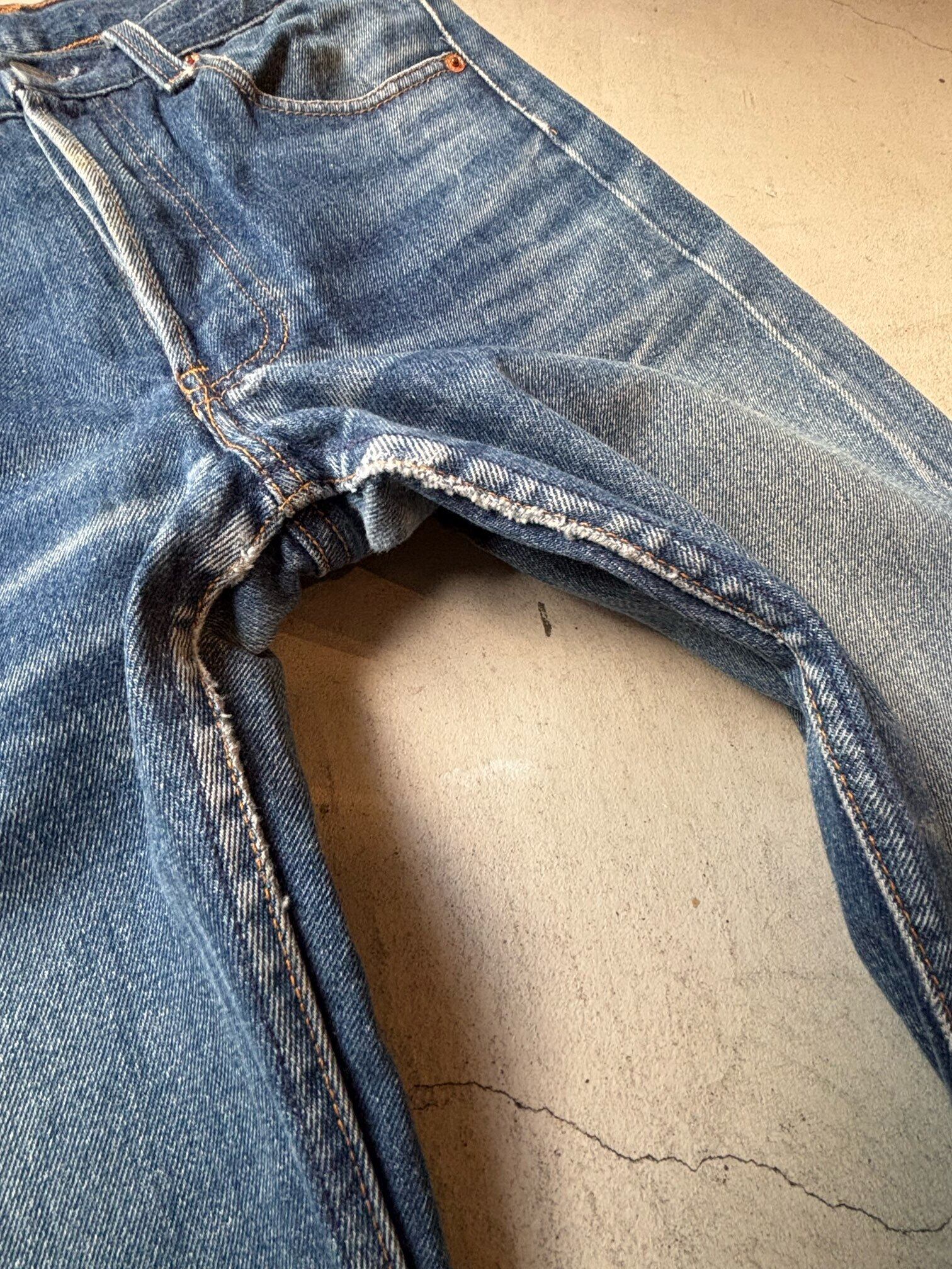 いわゆるレギュラーと言われる80年代〜90年代のリーバイスのデニムでもここまでいい色落ちをしているデニムは早々出てこないと思います。元の持ち主さんはジャストサイズで履いてくれていたのでしょう。膝裏のハチノスもしっかり出ていて、ビンテージデニムのような色落ちです。