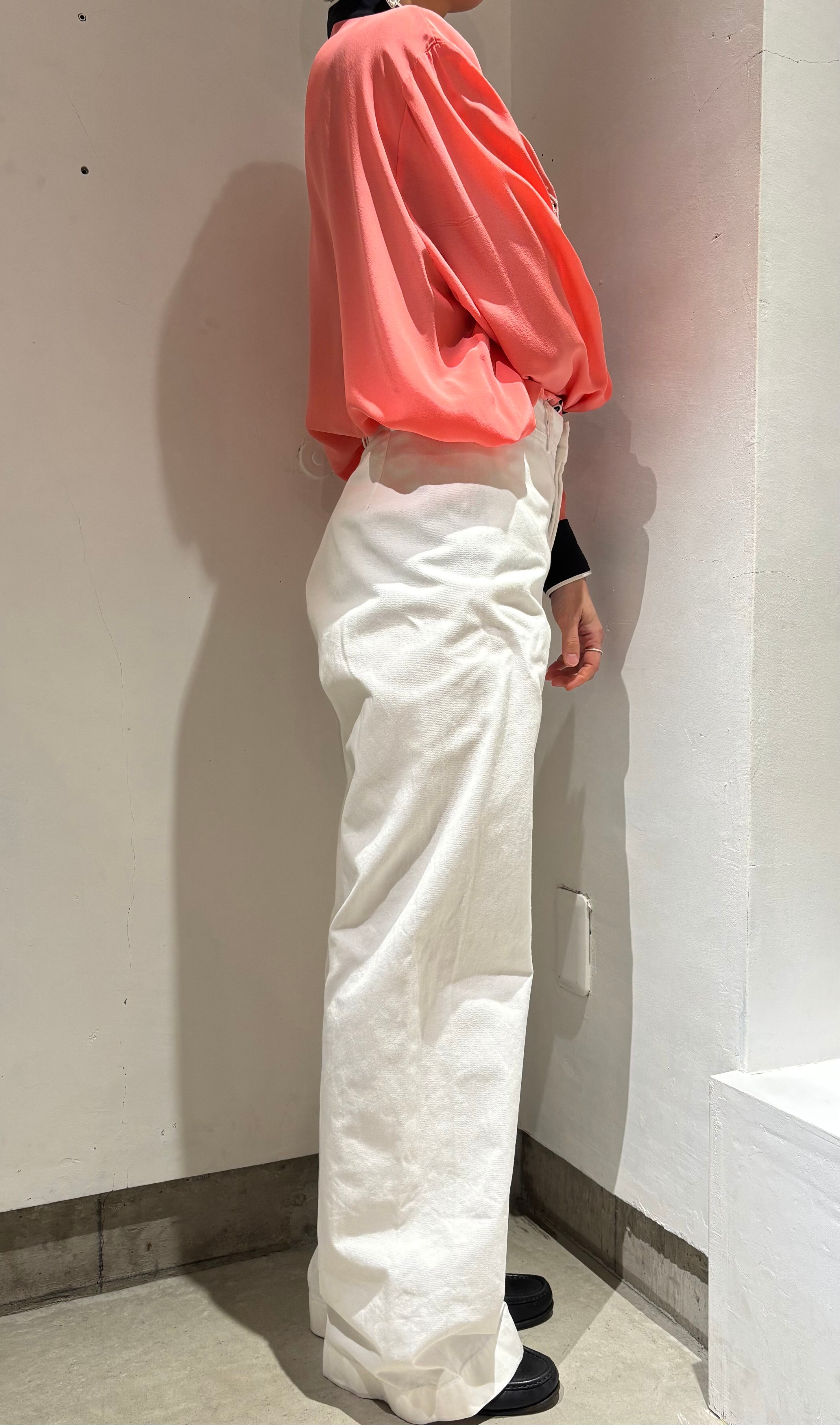 春先から白のボトムスは履きたくなると思いますが、春先は丈の短いブルゾンを合わせたり夏場はタイト目なteeを着たりと幅が効くパンツです。