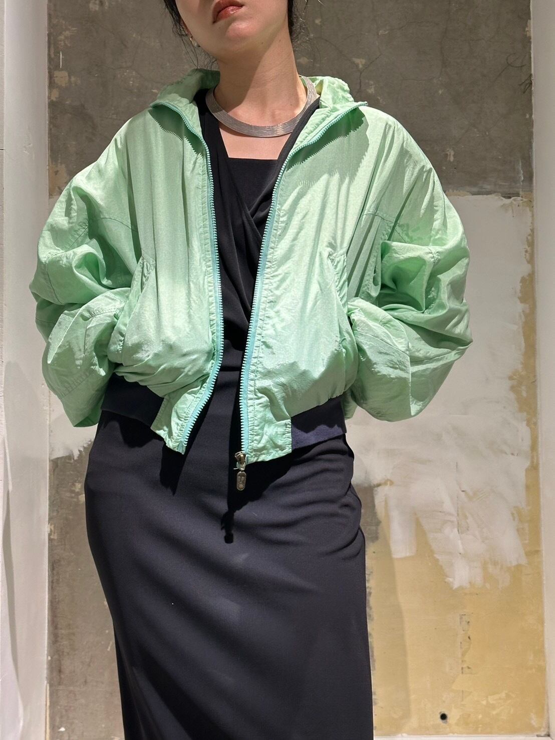色も綺麗なエメラルドグリーンでリブがかなり詰まったデザインなので、ボンバージャケットのように膨らんで見えるディテールになっています。